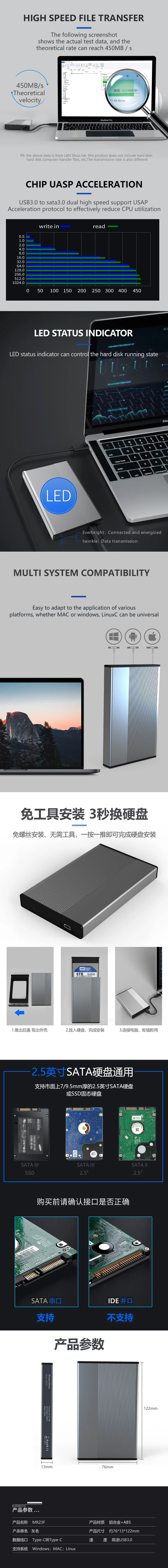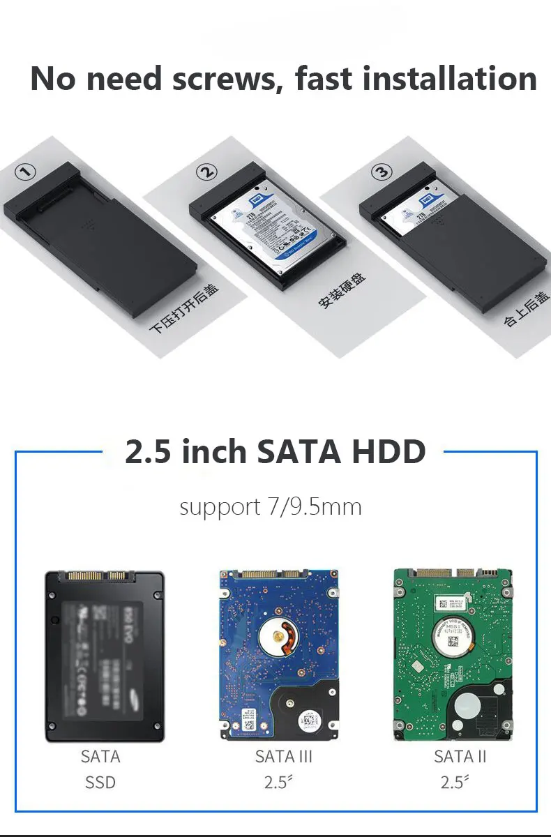 1. Поддерживает все стандартные жесткие диски SATA 7 мм/9,5 мм 2,5 дюйма до 6 ТБ (макс.)