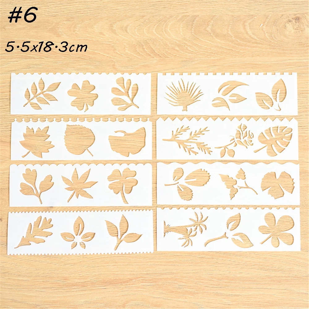 Подходит для пигмента, чернил, спрей, ручная роспись, ткань, стены, мебель, украшения. Различные рисунки трафаретов, удовлетворяют вашим основным потребностям живописи. Материал: Изготовлен из прочного пластика, многоразовый и простой в эксплуатации. Без BPA. Цвет: как на картинке Размеры: 5,5x18,3 см Соответствие единиц измерения: 1 см = 0,39 дюймов Посылка: 8 шт./компл. трафарет для шаблонов
