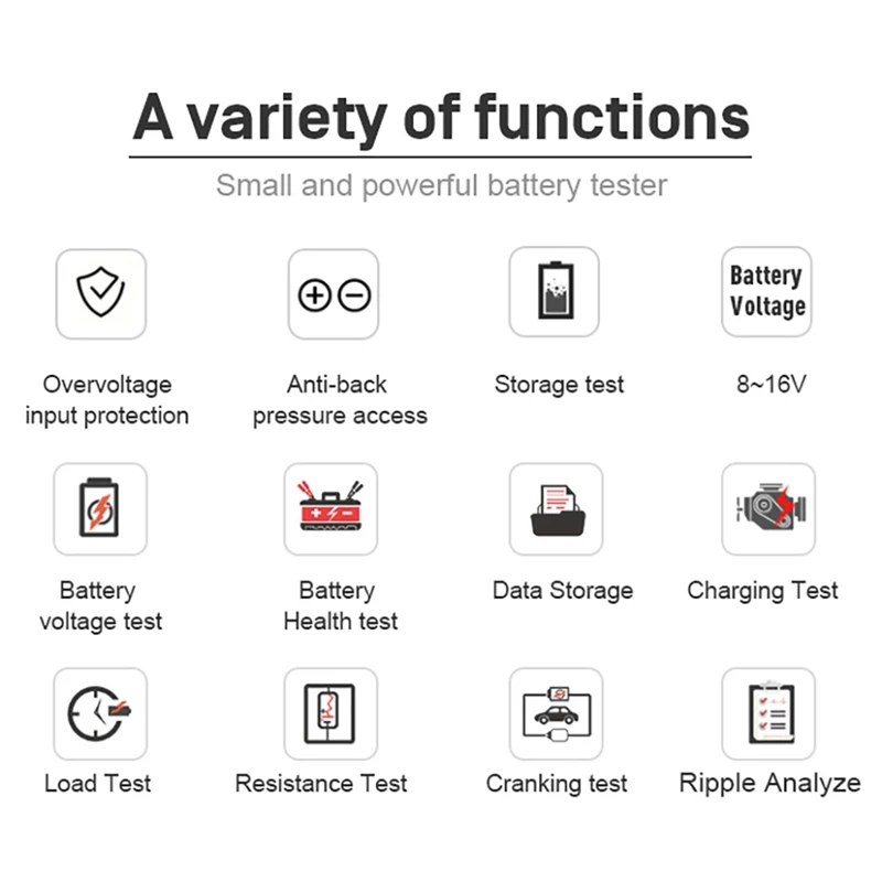 1.[Показания данных] тестер автомобильных аккумуляторов KONNWEI KW208 12 В способен эффективно анализировать и считывать важные данные автомобиля, такие как напряжение, внутреннее сопротивление, усилитель холодного запуска и емкость Ач, работоспособность аккумулятора и состояние зарядки.2.[точные измерения] этот профессиональный тестер автомобильных батарей обеспечивает точные результаты, рассчитывает холодопроизводительность батареи и степень старения, что позволяет быстрее и точнее ремонтировать автомобиль.3.[Широкая совместимость] новичкам или экспертам, этот диагностический тестер для автомобильных аккумуляторов можно использовать с широким выбором аккумуляторов 12 в 100-2000 CCA, обычными затопленными аккумуляторами, плоской пластиной AGM, спиралью AGM, А также гелевые батареи.4.[дополнительные характеристики] тестер автомобильных аккумуляторов KW208 отображает результаты тестирования в тексте, отображая напряжение батареи в реальном времени. Благодаря интеллектуальной 2. Дюймовой подсветке и главному чипу STM32 доступ к чтению является практичным и быстрым!Напряжение системы 12 вольт и проверка напряжения в форме волныРезультат теста хороший, перезарядка или заменаЕмкость холодного запуска усилителей (CCA), DIN, EN и IEC информация относительно номинальной мощности батареи.Система запуска и система зарядкиЗапись и воспроизведение данных аккумулятора.Тест батареи, тест на проворот коленвала, тест зарядки и другие дополнительные функции.Основные Стандарты батареи CA,CCA,BCL,MCA,JIS,SAE,EN,DIN и IEC поддерживаютсяПоддержка 8 языков: английский, немецкий, французский, голландский, русский, испанский, итальянский, португальскийЭтапы тестированияШаг 1. Подключите аккумулятор 12 В, красные зажимы к положительному полюсу и черные зажимы к отрицательному полюсу.Шаг 2. Тест батареи: сначала выберите тип батареи для тестирования ed, затем критерии тестирования и диапазон тестирования, а затем вы получите результаты в течение нескольких секунд.Шаг 3. Тест на проворот коленвала: после выбора функции тест на проворот коленвала следуйте инструкциям, чтобы запустить двигатель. Тест завершен.Шаг 4. Тест зарядки: после включения функции проверки зарядки Следуйте запросу, чтобы увеличить скорость до 2500 об/мин в течение 5 секунд, затем нажмите OK. Тест завершен.Цвет: черныйМатериал: АБСПосылка1 шт. тестер батареи KW2081 Инструкция по эксплуатацииВ комплект входит только указанное выше содержимое, другие продукты в комплект не входят.Примечание: светильник вая съемка и различные дисплеи могут привести к тому, что цвет товара на изображении будет немного отличаться от реального. Допустимая погрешность измерения +/- 1-3 см.