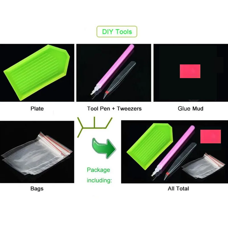 Посылка включает в себя: Холст * 1, пинцет * 1, ручка для инструментов * 1, пластина * 1, достаточное количество алмазов и клеевой грязи.