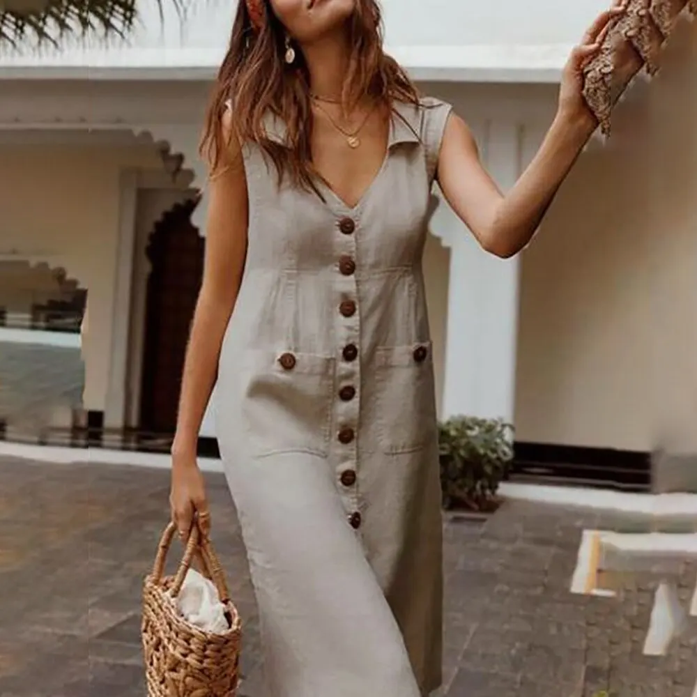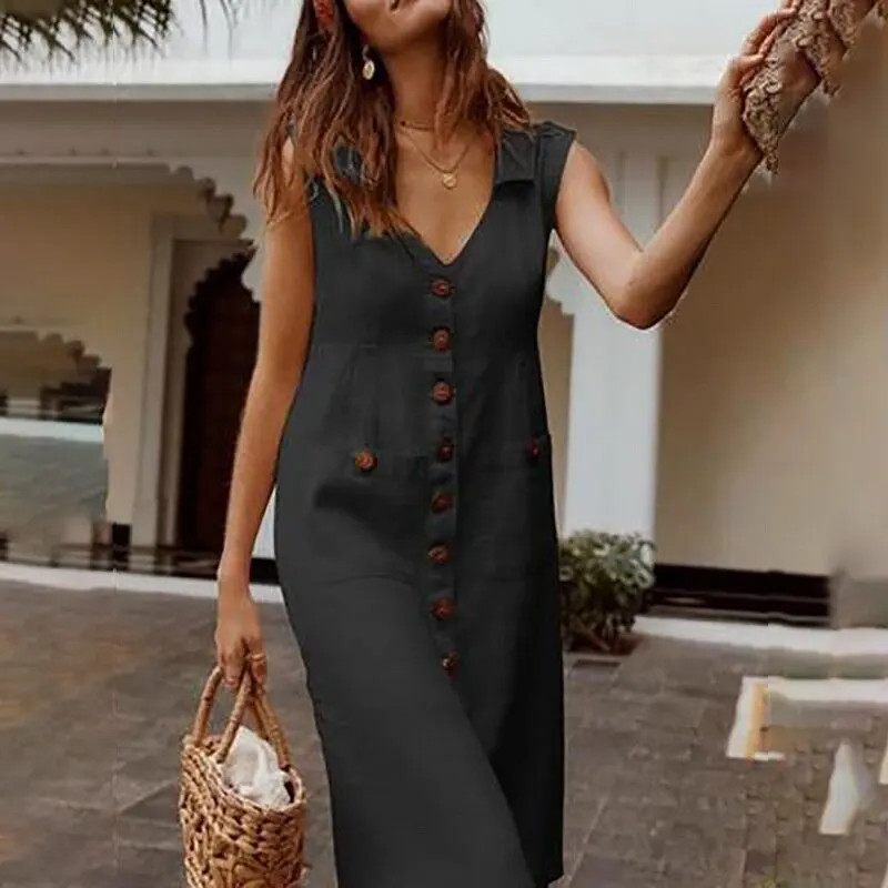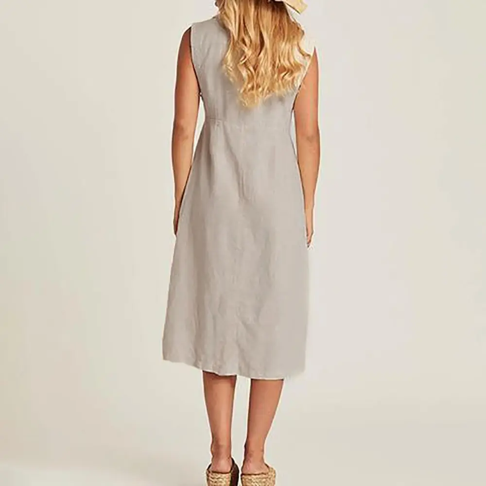 Платье женское средней длины с V-образным вырезом, Модный повседневный Однотонный сарафан без рукавов в стиле бохо, с V-образным вырезом и карманами, размера плюс, лето 2021