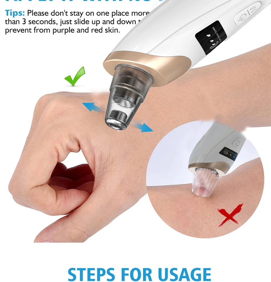 Я очень доволен, устройство работает очень хорошо. У меня всегда были проблемы с очень яркими черными точками, но результаты есть с этим устройством. Откройте поры кожи с горячей водой или пара перед использованием и хорошо очистите и Вымойте холодной водой или с помощью адаптированного лосьона после использования. Оставляет кожу влажной/мокрой во время использования, попробуйте Уровень 1 перед прохождением на высоких скоростях, потому что он очень мощный уровень всасывания!