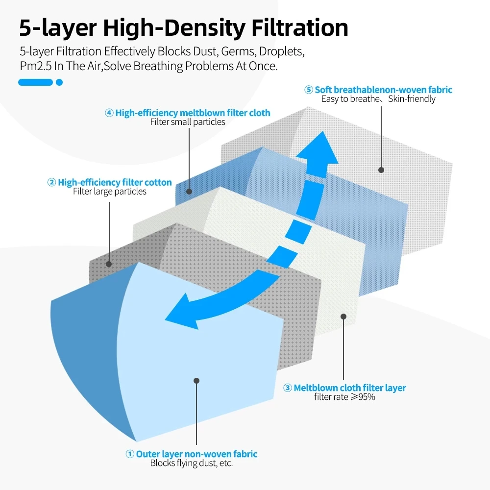1. Легко Дышать: эта маска может использоваться в целом, эффективно блокируя капельки воды и пыль. Ткань впитывает влагу и отводит пот. Только для одного использования.