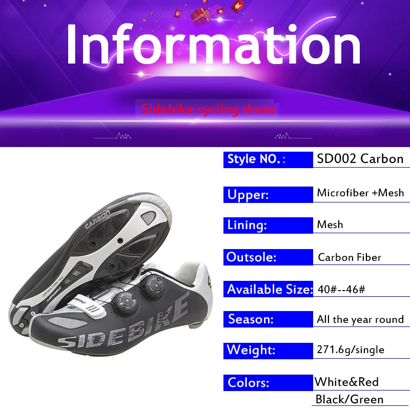 Sapatos ciclismo обувьБренд: SIDEBIKE SD002-blackМужские велосипедные кроссовкиПол: для мужчин и женщинОбувь для шоссейных велосипедовЦвет:Черный/белый/желтыйSaoatilha ciclismo Материал верха: ПВХ + сетчатая тканьОбувь для шоссейных велосипедовМатериал подошвы: углеродное волокноМужские кроссовкиРазмер:40/41/42/43/44/45/46