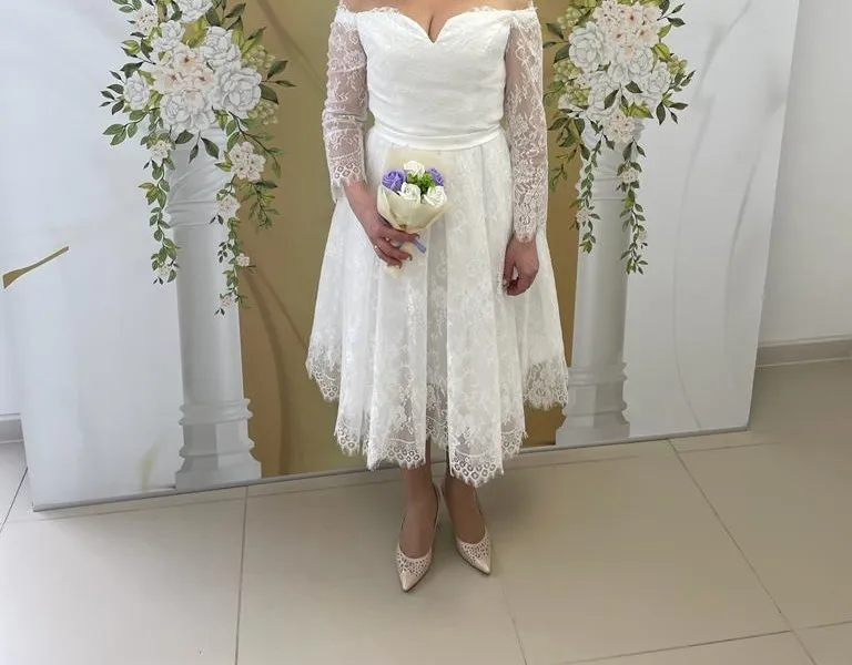 Короткое свадебное платье с пышными рукавами и воротником в виде се...