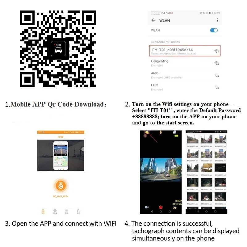 1. Загрузите приложение 2. Включите тахограф, откройте настройку в телефоне WIFI-FH-T01_a09f1045dc14 подключения (пароль по умолчанию "88888888") 3. Откройте приложение и Подключитесь к WIFI 4. Соединение успешно, содержимое тахографа может отображаться одновременно на телефоне