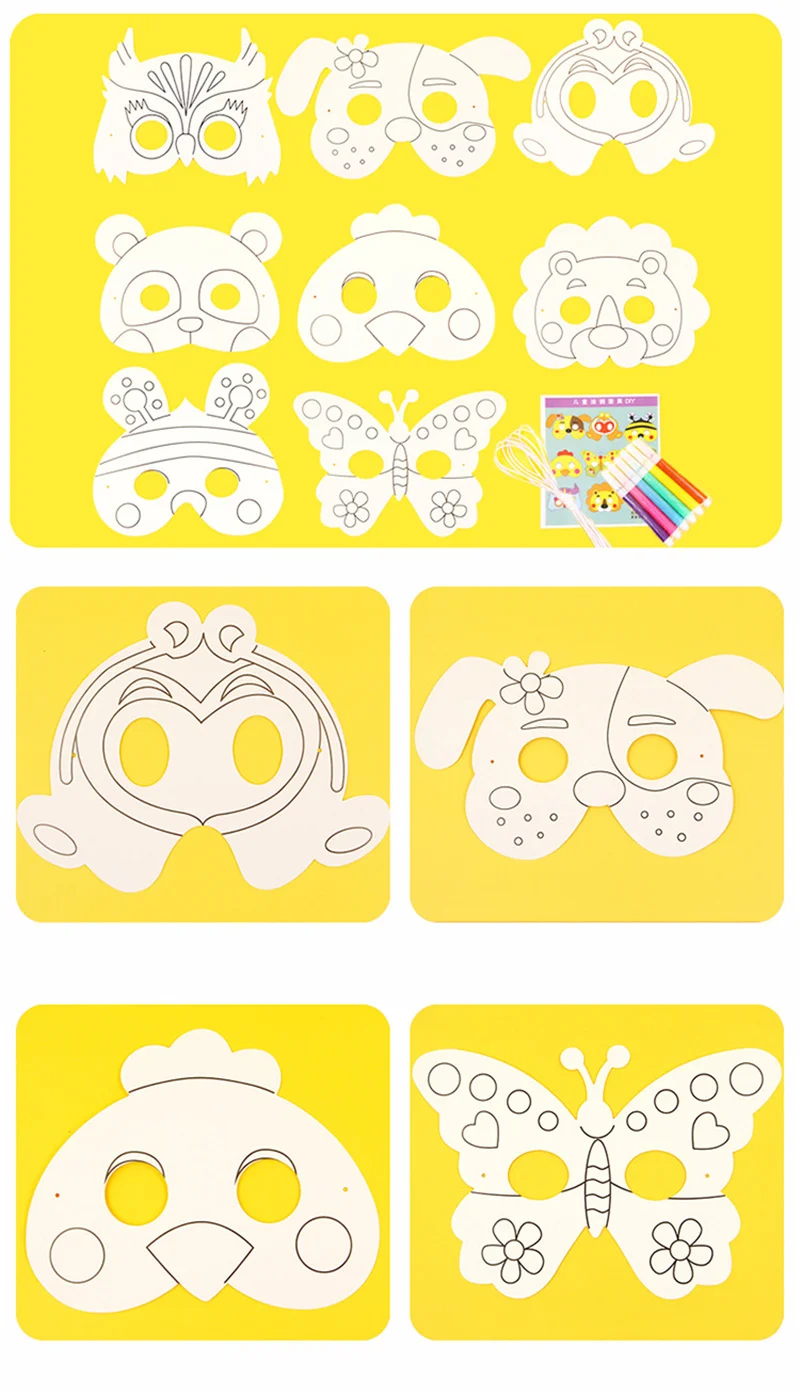 Набор из 8 стилей, набор из 6 акварельных ручек бесплатно. Посылка материалов оснащена образцом карты, который можно использовать в качестве примера для окрашиванияМатериал очень светильник и удобный. Маска белая. Вы можете нарисовать на маске желаемые цвета и узоры.После того, как дети раскрасят, они могут надеть резинку и носить их прямо на лице. Вы можете нарисовать желаемый эффект в школьных занятиях.Его также можно использовать как небольшую игрушку для занятий родителями и детьми. Это также может быть маска с граффити для учащихся детских садов и учеников начальной школы, чтобы рисовать и рисовать анимацию