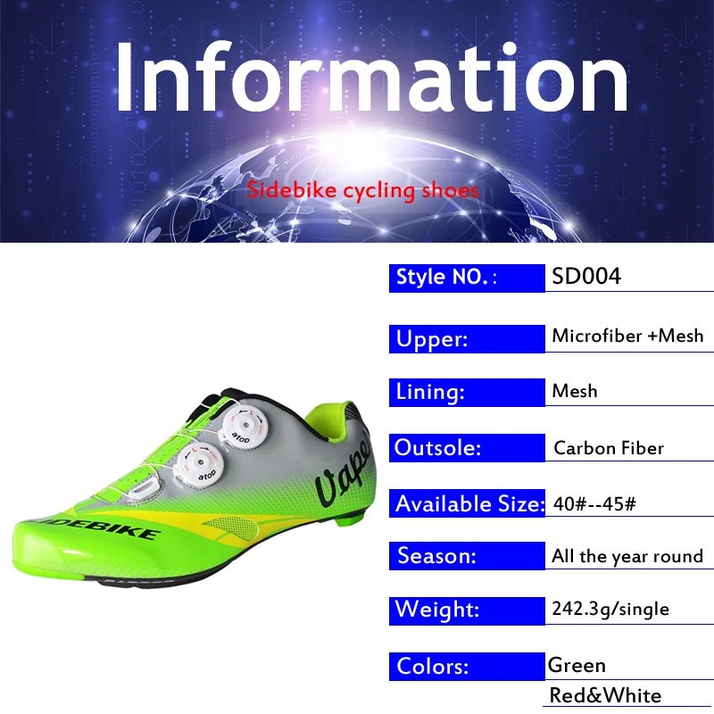 Обувь sapatos ciclismoНазвание бренда: SIDEBIKE SD004-greenМужские велосипедные кроссовкиПол: мужчин и женщинОбувь для дорожного велосипедаЦвет:Белый/зеленыйSaoatilha ciclismo Материал верха: ПВХ + сетчатая тканьОбувь для езды на велосипедеМатериал подошвы: углеродное волокноМужские кроссовкиРазмер:40/41/42/43/44/45/46