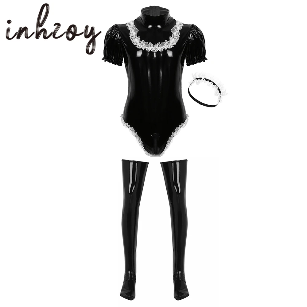 Мужской костюм для трансвестита нижнее белье Sissy, костюм горничной, косплей, гей, эротический костюм, ночной клуб, кожаные сексуальные боди и Кружевная повязка на голову, чулки