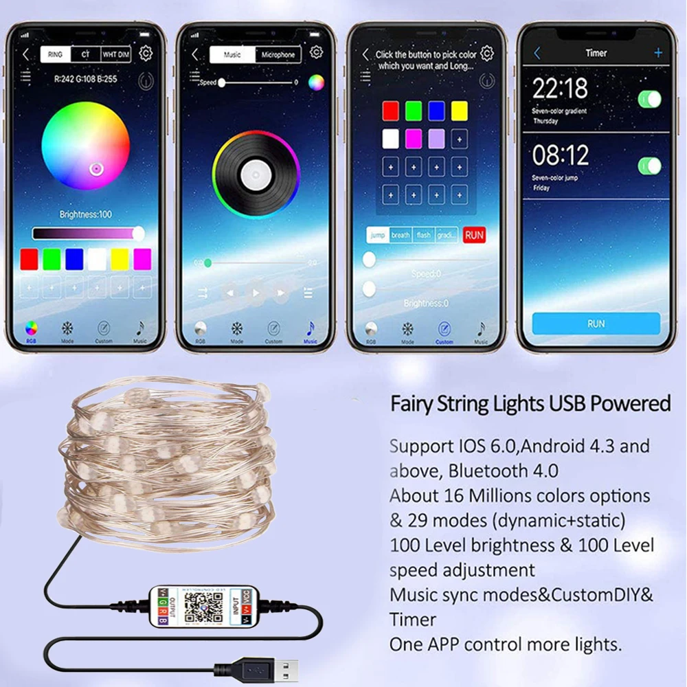 Выберите AliExpress стандартную транспортировку. Гарантированно получите товар в течение 30 дней. Позвольте вам получить посылка до Рождества, сделать рождественские украшения, желаю вам счастья USB Bluetooth Сказочный светильник s медный провод светодиодный светильник гирлянда спальня для дома Свадьба Новогоднее украшение Рождественский светильник sПримечание:Есть qr-код на светильник, вы можете непосредственно отсканировать код для загрузки приложения.Один мобильный телефон может одновременно управлять несколькими струнами светильник Спецификация:Размер упаковки: 12*10*3 смУровень защиты: IP65Световой поток: 6 (лм)Цветовая температура: 3000 (K)Входное напряжение: 5 (в)Размер: 1 м 10 светодиодов/5 м 50 светодиодов/10 м 100 светодиодов/15 м 150 светодиодов Функция:Более 16 миллионов цветов29 различных динамических режимовСинхронизация с музыкойФункция таймераКонтроль яркости/скорости от 1%-100%На заказ, чтобы создать ваше Большое светодиодное лунное освещение Примечание:1. Фактический цвет может быть s светильник, который сильно отличается от изображения из-за различных эффектов монитора и светильник. Возможны отклонения на 1-3 см вследствие измерений вручную.2. Если вам нужно видео светодиодный светильник, как работать, пожалуйста, свяжитесь с нами.3. Пожалуйста, подтвердите подходящий товар, если он соответствует вашим моделям перед покупкой. Особенности:1. Каждый светодиодный светильник на уникальной рождественской гирлянде-это умные лампочки, которые полностью программируются.2. Вы либо выбираете предварительно изготовленный светильник и анимацию из приложения, либо даже программируете свой собственный дизайн, чтобы соответствовать вашим любимым цветам спортивных команд, уникальной анимации и многому другому.3. Управление приложением: все огни могут управляться удаленно с помощью приложения, доступного в магазине приложений iOS и Android.4. Быстрая настройка: установка действительно проста и занимает всего минуту благодаря сопряжению Bluetooth. Подключение Wi-Fi. Светильник s можно настроить с помощью Wi-Fi вашего местного дома/офиса, так что вам не нужно устанавливать соединение каждый раз, когда вы используете светильник. Посылка:Только USB: только светодиодный светильник (Нет контроллера без подключения Bluetooth)USB Bluetooth:Bluetooth подключение светодиодный светильникUSB управление музыкой: управление музыкой + светодиодный светильник (Нет подключения Bluetooth)