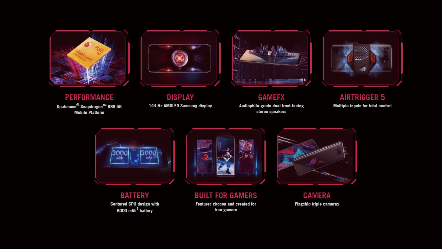 ПроизводительностьQualcomm®Snapdragon™Мобильная платформа 888 5GДисплейДисплей Samsung AMOLED 144 ГцGAMEFXАудиофильский класс двойная фронтальная стереодинамикиAIRTRIGGER 5Несколько входов для полного контроляАккумуляторЦентральный процессор с батареей 6000 mAh1Создан для геймеровФункции, выбранные и созданные для настоящих геймеровКамераФлагманские тройные камеры