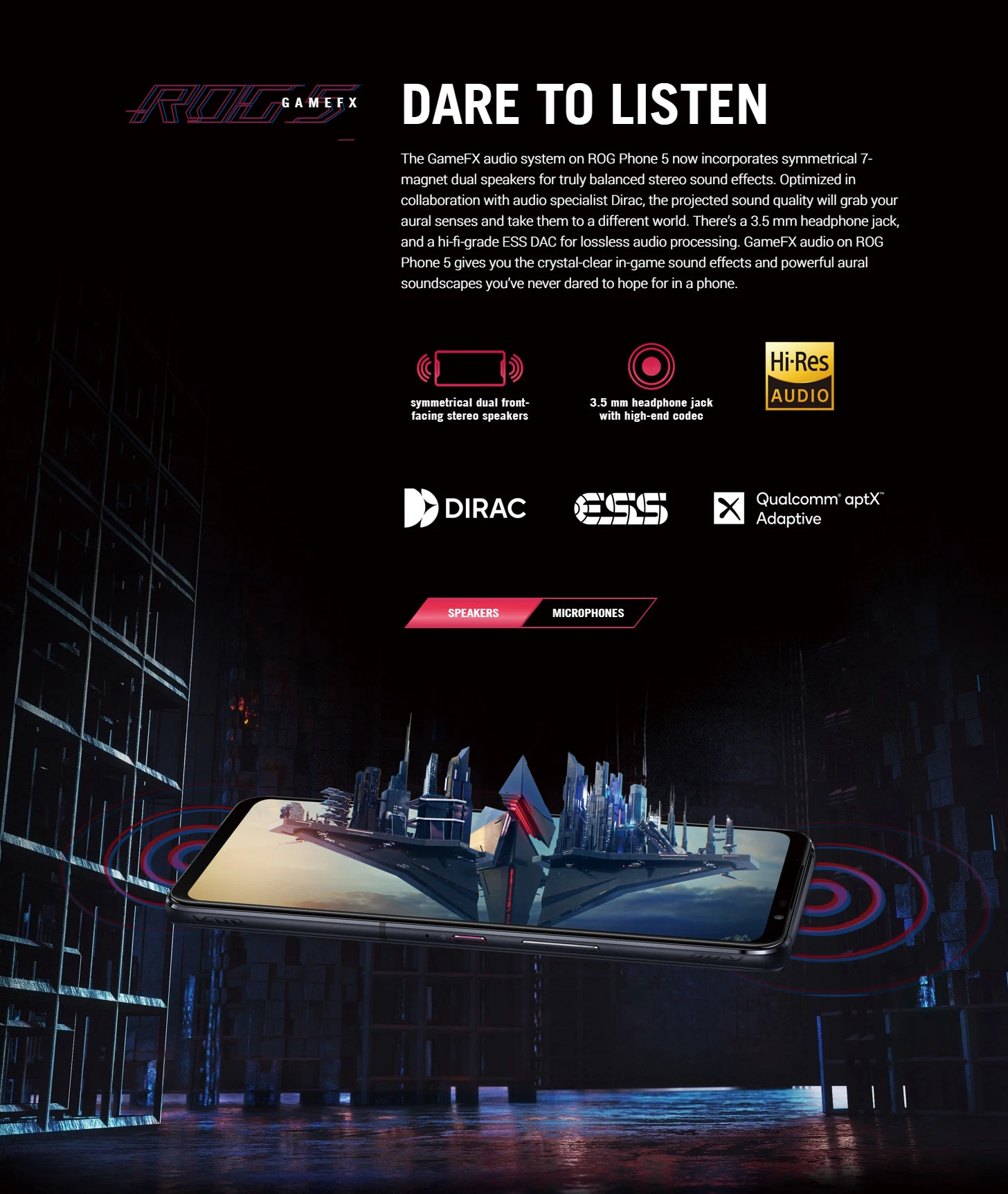 В GameFX аудиосистема на ROG Phone 5 теперь включает в себя симметричный 7-магнит двойной колонки для по-настоящему сбалансированный стерео звуковые эффекты.