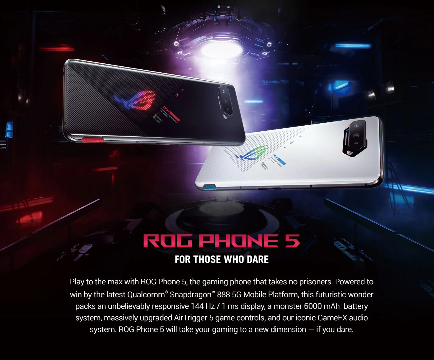 Для тех, кто осмелитсяИграйте в max с ROG Phone 5, игровым телефоном, который не принимает пленных. Питание от последней версии Qualcomm®Snapdragon™888 5G Мобильная платформа, это футуристическое чудо упаковывает невероятно отзывчивый дисплей 144 Гц/1 ms, Батарейная система monster 6000 mAh1, массово модернизированное управление AirTrigger 5, и наша Культовая аудиосистема GameFX. ROG Phone 5 превратит ваши игры в новое измерение-если вы осмелитесь.