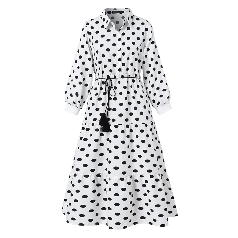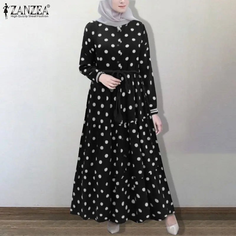 Мусульманское платье макси в горошек для женщин весна-осень 2022 элегантное платье ZANZEA с поясом официанта с оборками Дубай абайя Турция хиджабКафтан платья