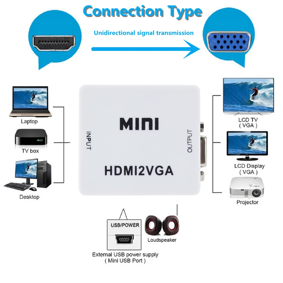 Введение: HDMI-совместимый с VGA видеоконвертер высокой четкости, который преобразует HDMI-совместимый цифровой сигнал в VGA аналоговый сигнал и аналоговый аудиосигнал. HDMI-совместимое соединение сигналов для PS3 для XBOX360, Blue-ray DVD, HD телеприставки, CRT/светодиодный дисплей и т. Д. Вы можете легко смотреть hd-видео на обычном телевизоре без интерфейса, совместимого с HDMI. Особенности: · Нет необходимости устанавливать драйверы, портативные, гибкие, подключи и работай · Низкая мощность, нет необходимости в источнике питания · Вывод аудио синхронизации с видео · Высокая пропускная способность поддержка 1920x1080 @ 60 Гц Характеристики: · Входной порт: HDMI-совместимый женский · Выход Порты и разъёмы: VGA Женский и 3,5 мм аудио разъем · Цвет: белый Посылка включает в себя: · 1 x HDMI2VGA конвертер · 1 х USB кабель питания (черный и белый цвет, отправляется случайным образом.) · 1 х Руководство USB