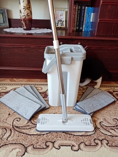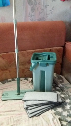Товар как в описании. Пришло все целое. Качество хорошее. Швабра легкая и удобная. Немного нужно привыкнуть к ней. В общем отличный набор. За 10-15 мин с одним ведром воды помыл полностью 3 комнаты. Удобно в ведре сделаны дренажные отверстия. Отжимается швабра отлично. При отжиме нужно придерживать ведро чтобы не опрокинуть. Рекомендую продавца и данный товар.