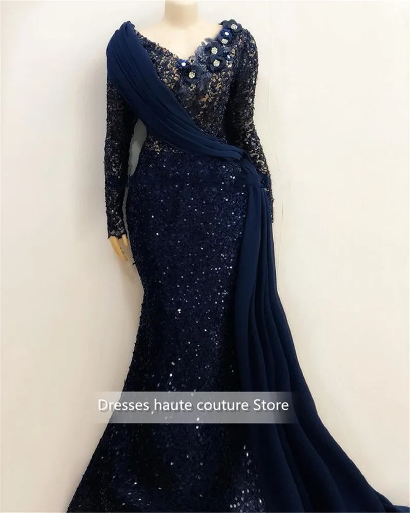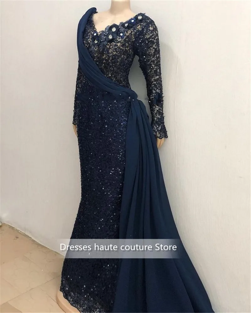 Роскошные африканские кружевные вечерние платья с длинным рукавом 2021 Aso Ebi вечерние платья со складками темно-синего цвета для выпускного вечера