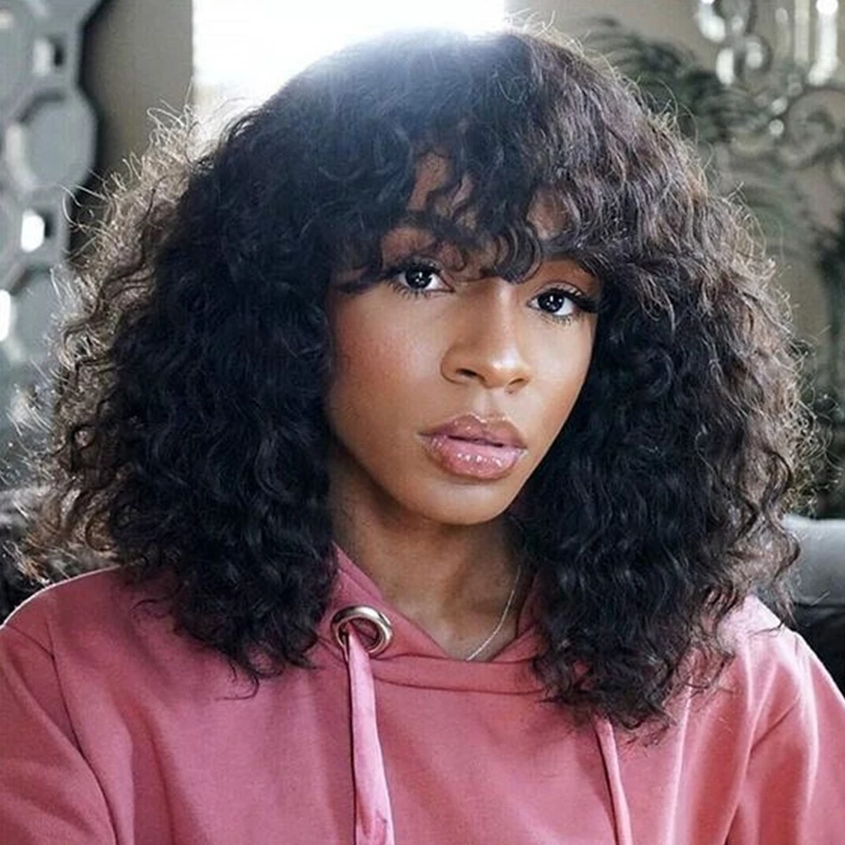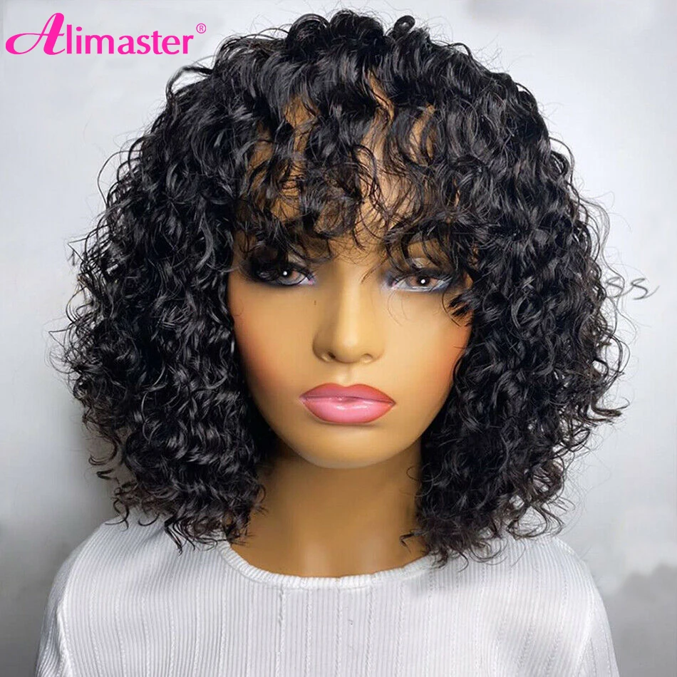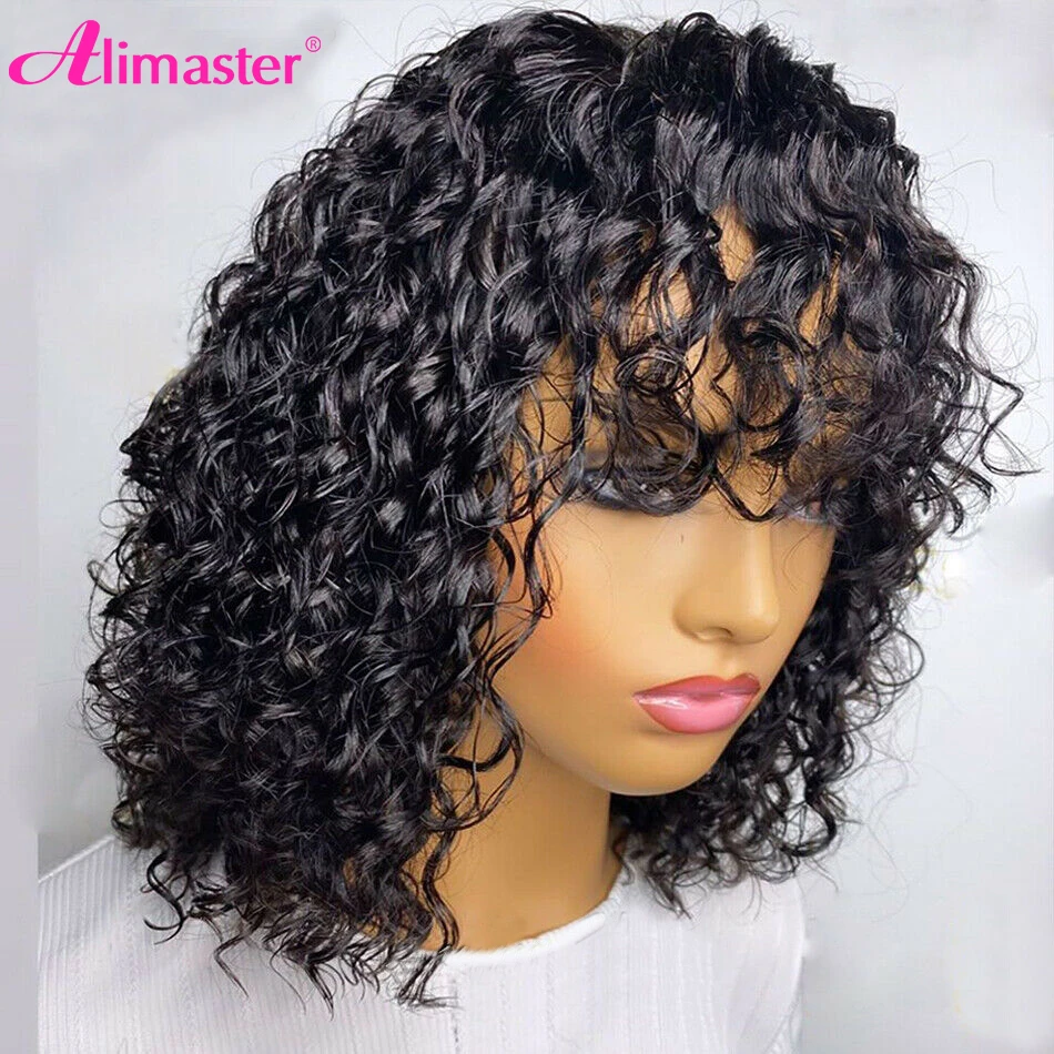 Парики из человеческих волос с волнистыми волосами с челкой, Волнистые Короткие вьющиеся волосы, парик из человеческих волос, бразильские полноразмерные парики машинной работы для женщин