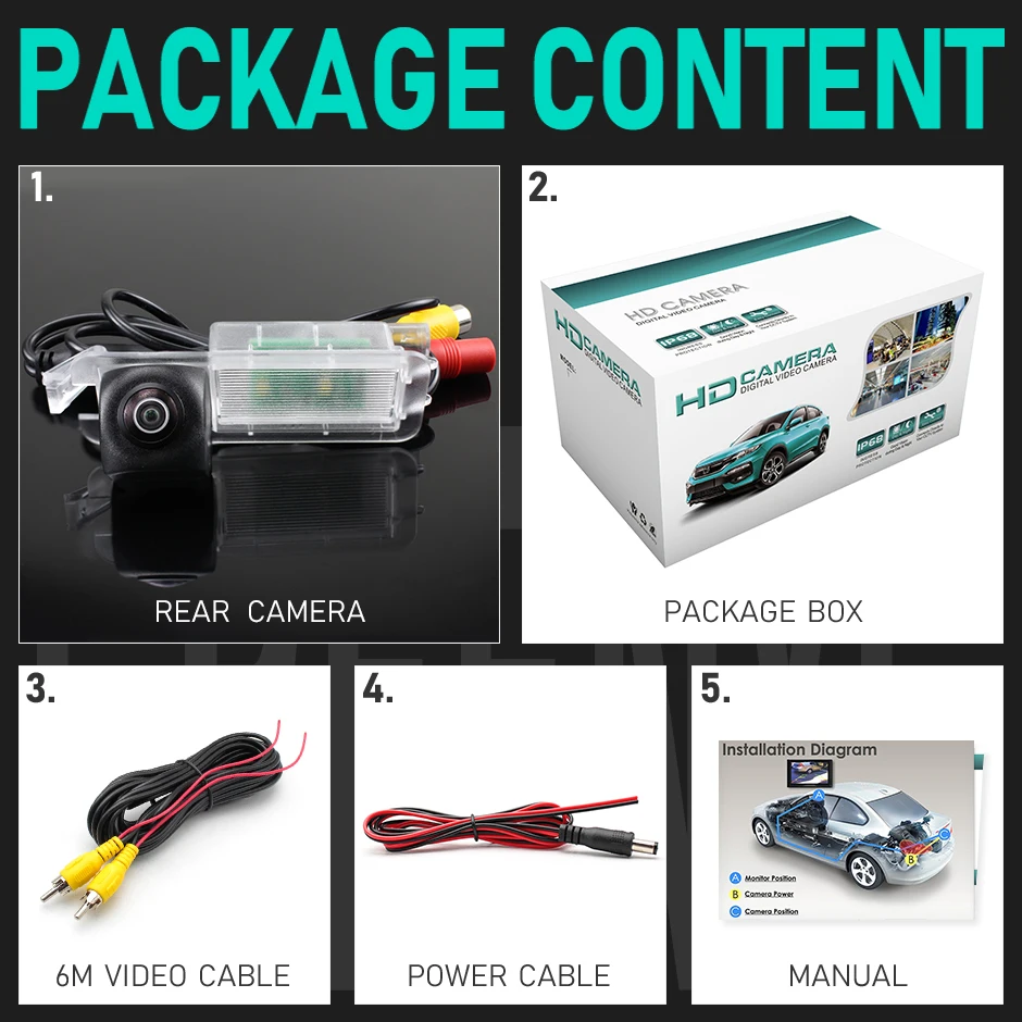 1. Задняя камера2. Коробка для посылка3. Видео кабель (6 м)4. Кабель питания5. Руководство пользователя