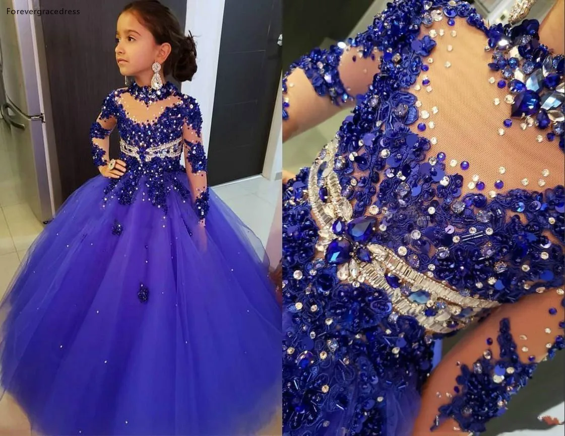 Роскошные ярко-голубые платья с бусинами и кристаллами для девочек, праздничные платья принцессы с высоким воротником, иллюзионные платья с длинным рукавом для маленьких детей, одежда для вечеринки