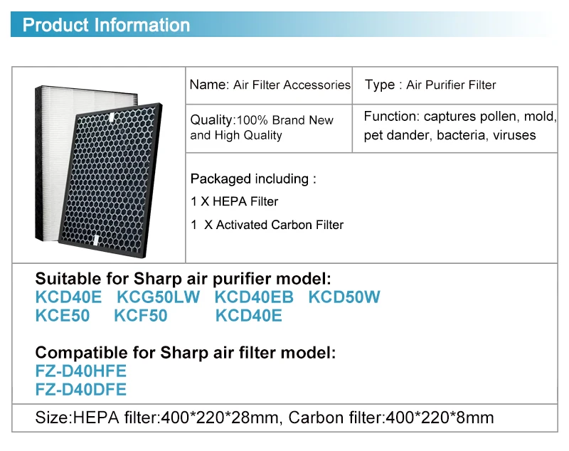 Размер: Hepa фильтр: 400*220*28 мм и Активный угольный фильтр: 400*220*8 ммПосылка включает в себя: Hepa фильтр * 1 и Активный угольный фильтр * 1