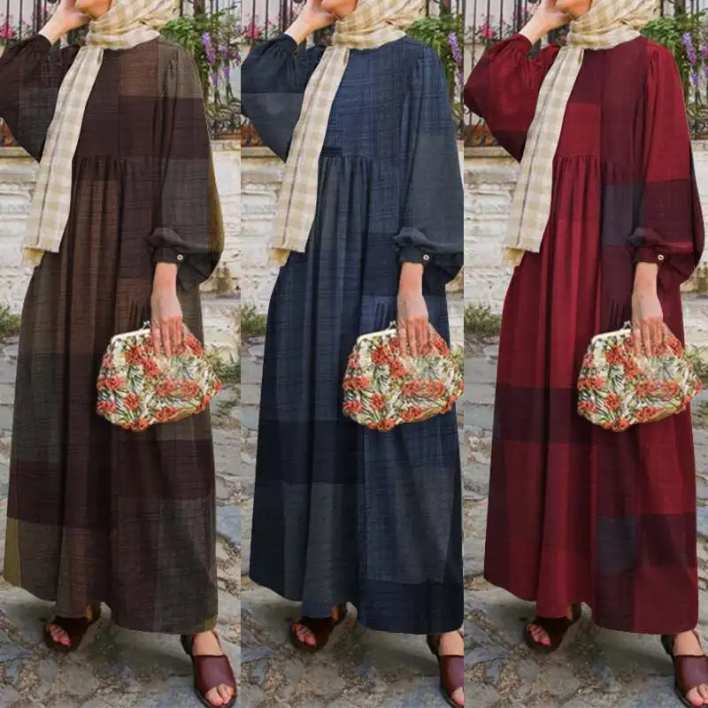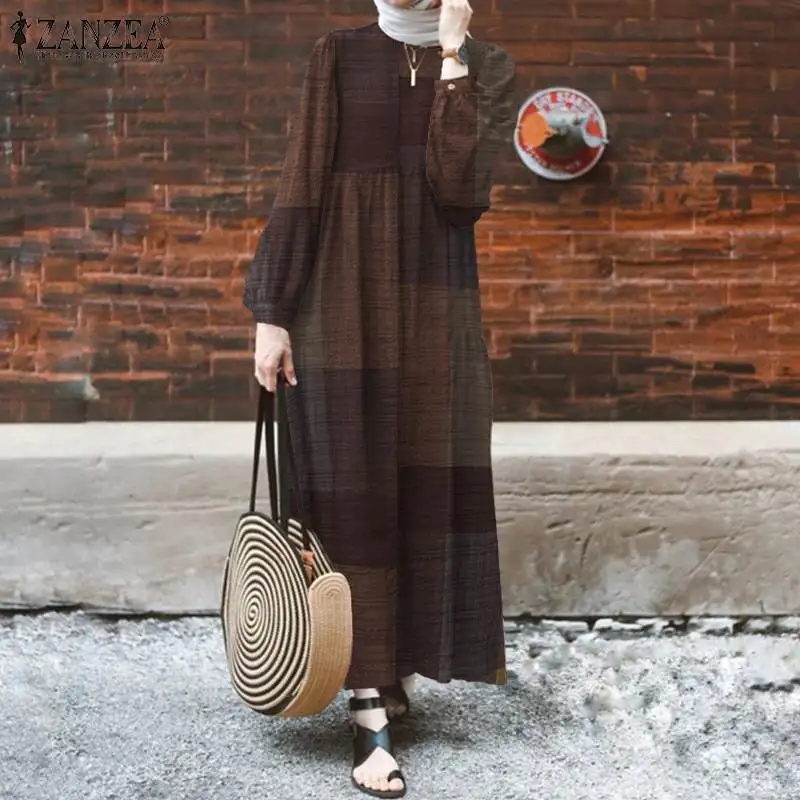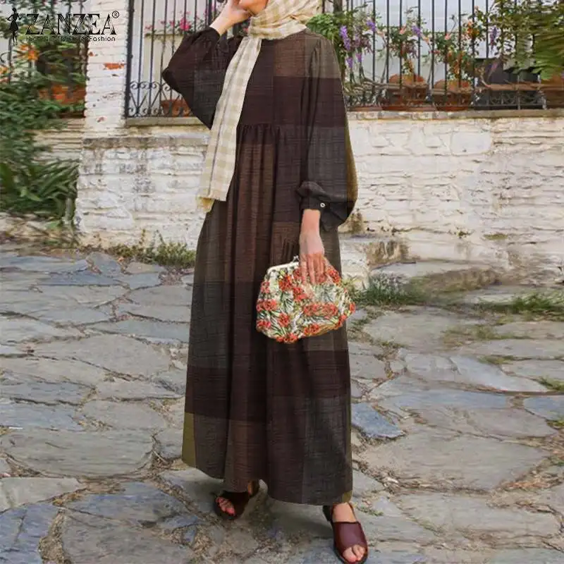 Исламская одежда, кафтан, клетчатый халат ZANZEA, женские мусульманские платья, повседневное свободное платье, длинное платье с длинным рукавом, марокканская Абая, хиджаб