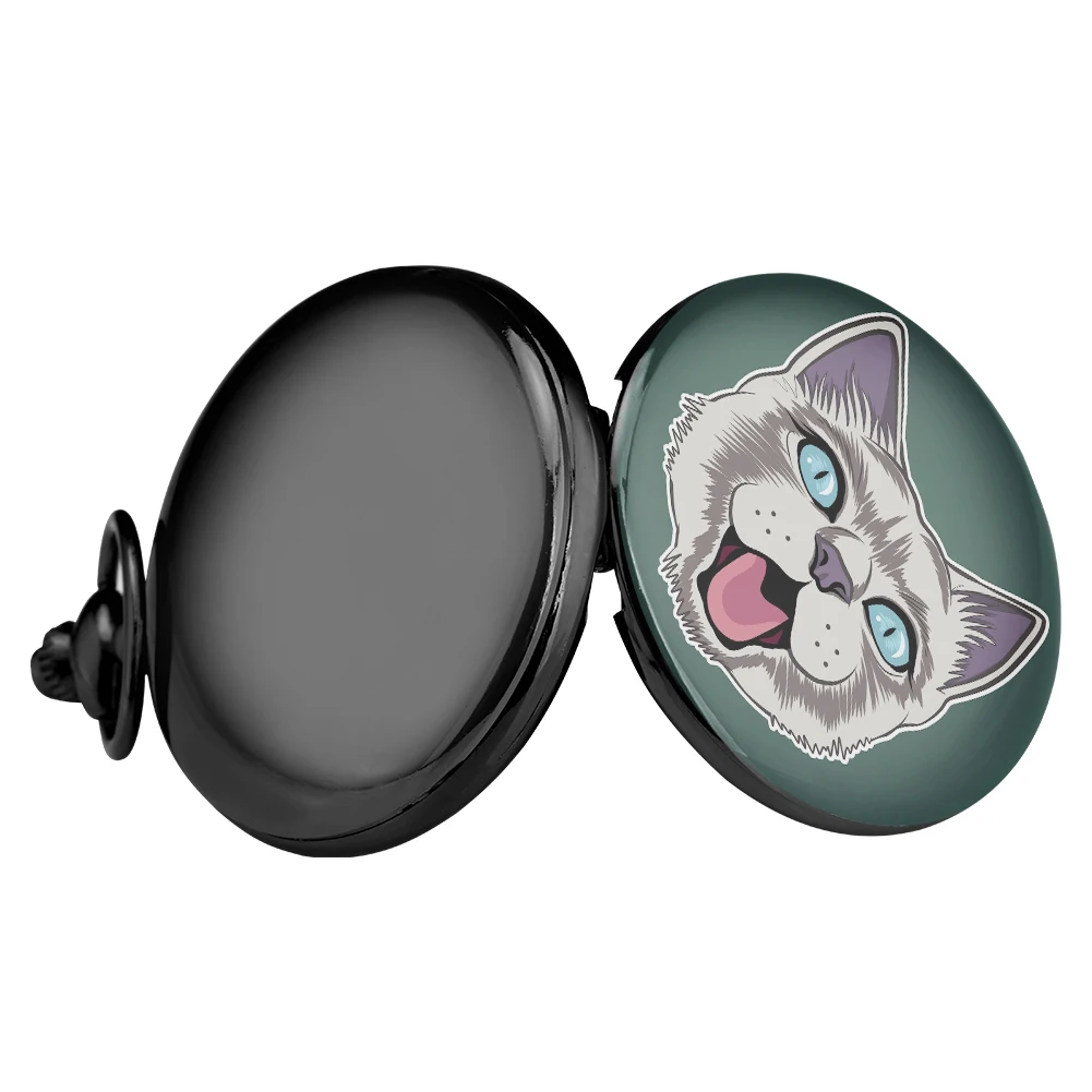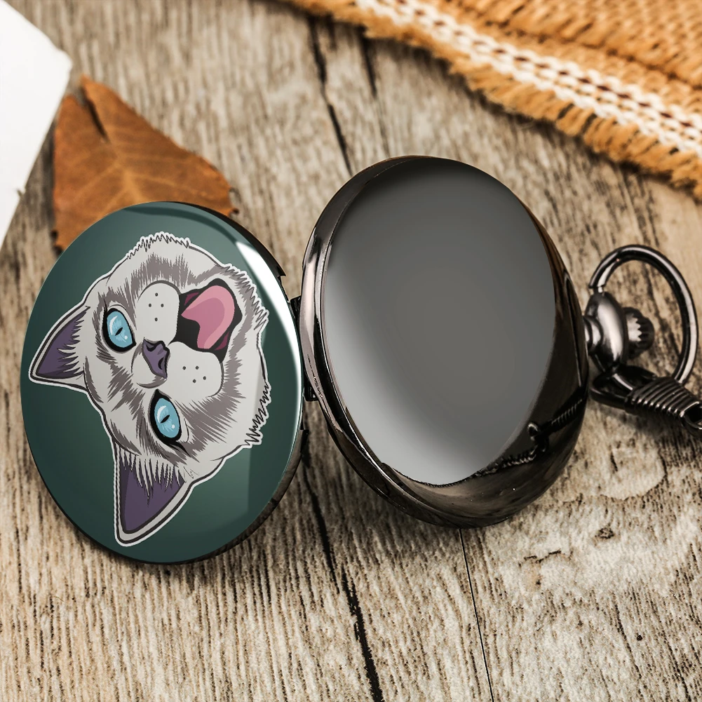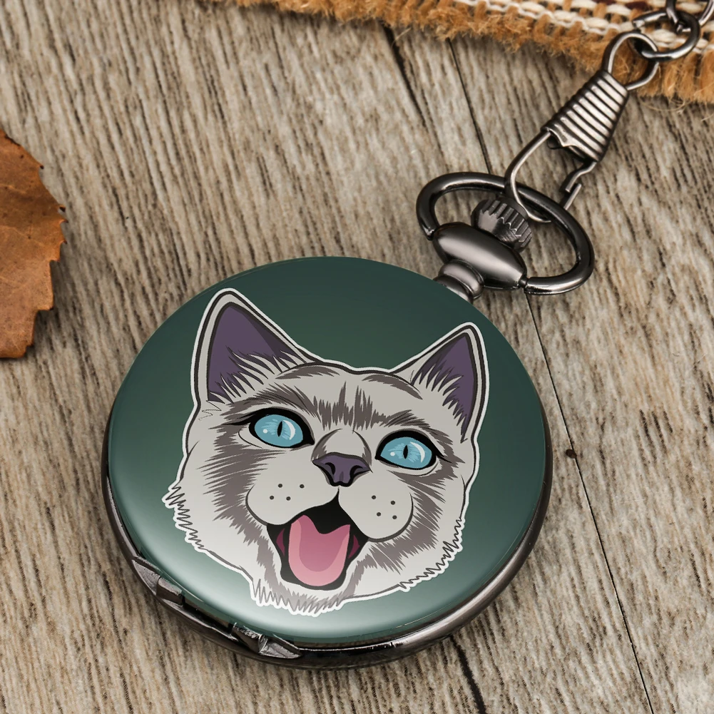 Карманные часы для мальчиков и девочек, милые зеленые флип-часы с головой кошки и белым циферблатом с цифрами, часы с толстой цепочкой, милый сувенир в стиле Харадзюку