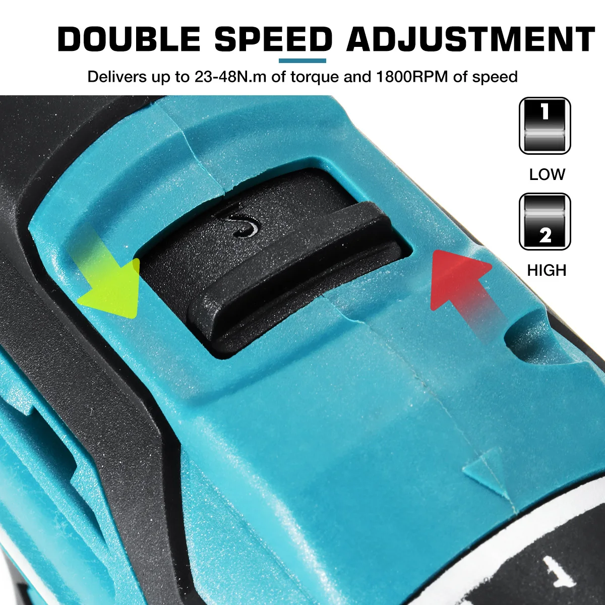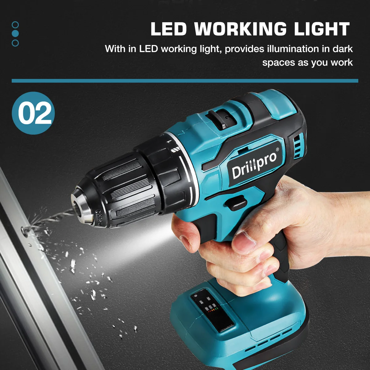 Эксплуатация-Обеспечивает до 23-48N.m крутящего момента и 1800 об/мин скорости-21 + 1 этап настройки, обеспечивает 21 крутящий момент и режим сверления для высокой точности работы-1/2 "без ключа трехкулачковый сверлильный патрон для быстрой и простой замены бит, удерживая до 13 мм бит-Светодиодный Светильник обеспечивает освещение в темных пространствах при работе