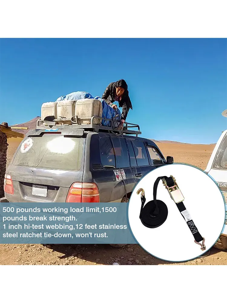 Особенности:Предел рабочей нагрузки 500 фунтов, прочность разрыва 1500 фунтов.1 дюймовая высокотестовая тесьма, трещотка из нержавеющей стали 12 футов, не ржавеет.Чрезвычайно прочные стальные S-Крючки с покрытием из нержавеющей стали остаются на месте на протяжении всего вашего путешествия и предотвращают повреждение вашего автомобиля.Идеально подходит для Каяка, доски для весла, подвижных принадлежностей или любого снаряжения, которое требует надежного завязывания.Спецификация:Размер: около 1x12 футов (Д x Ш)Цвет: черныйВес: около 260 гУпаковочный лист: