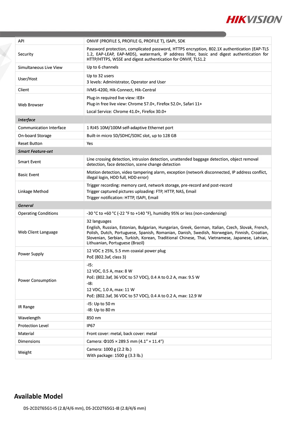 Номер моделиDS-2CD2T65G1-I5
