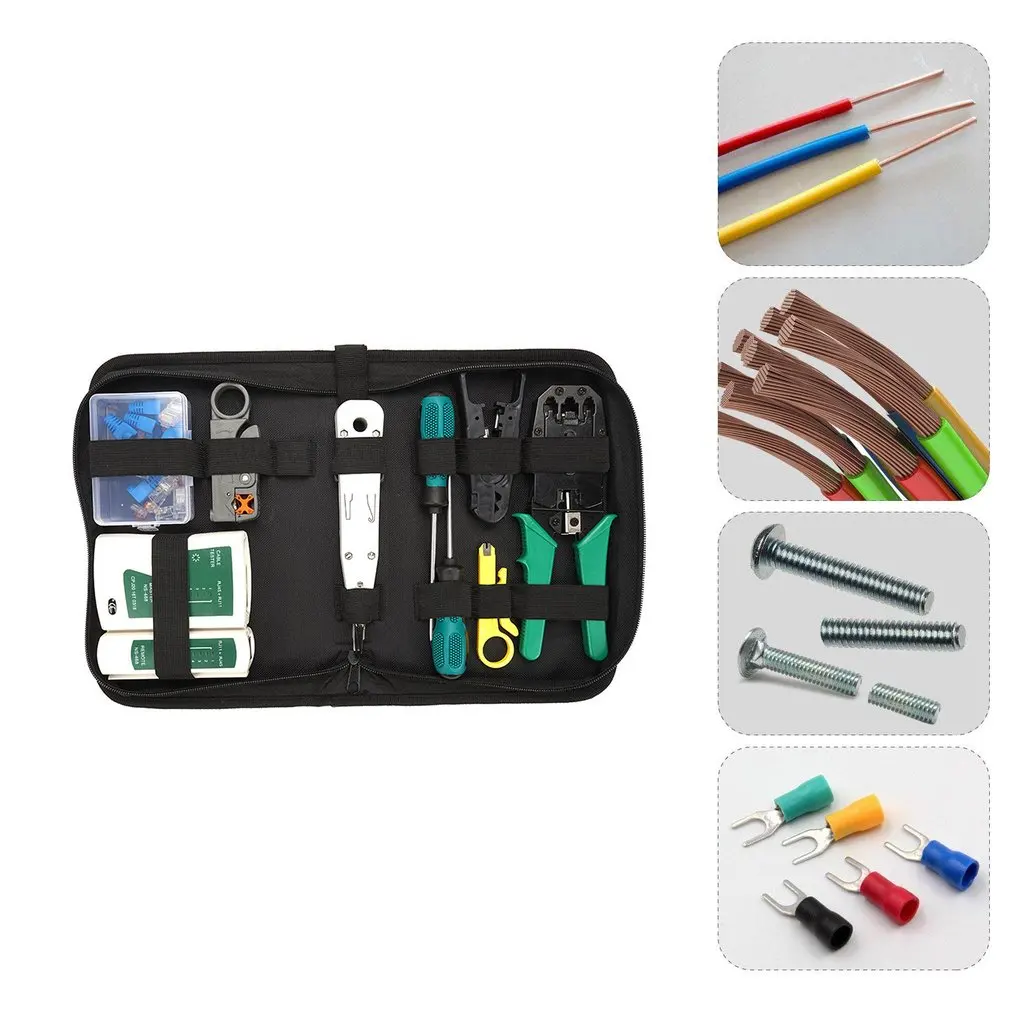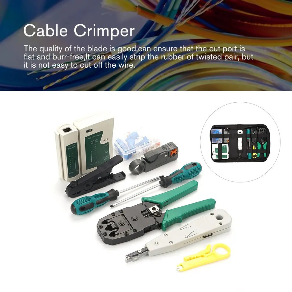 Посылка включает в себя:1 х щипцы для кабеляСетевой тестер-1 шт.1 x резак для зачистки проводов1 x инструмент для ударного удара2 х Черный Многофункциональный инструмент для зачистки проводов и резак1 отвертка с прорезямиОтвертка Phillips-1 шт.1 х Кабельный соединитель1 x сумка для инструментов