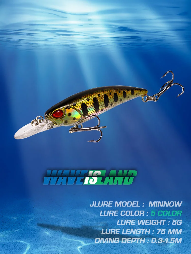 Информация о продукте: Бренд: WAVEISLAND Модель приманки: Minnow Тип приманки: жесткая рыболовная приманка Вес приманки: 5 г Длина приманки: 75 мм Глубина погружения: 0,3-1,5 Плавучесть: Topwater Крючки: оснащены антикоррозийными крючками Глаза: 3D рыбий глаз Кольца: велосипедные Цвета: 5 цветов