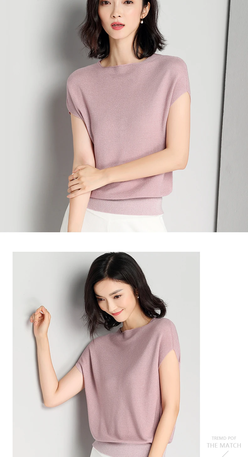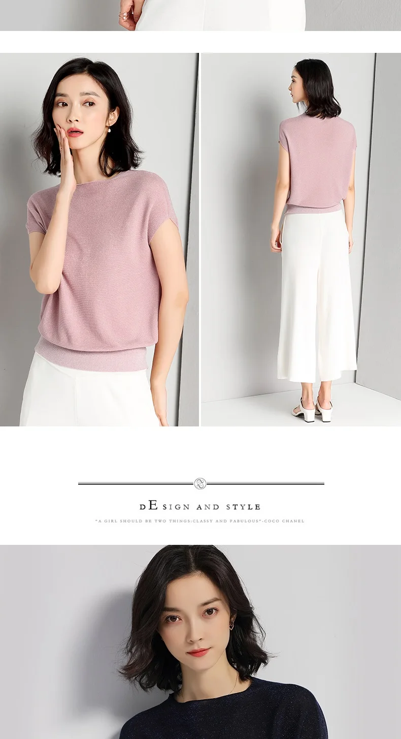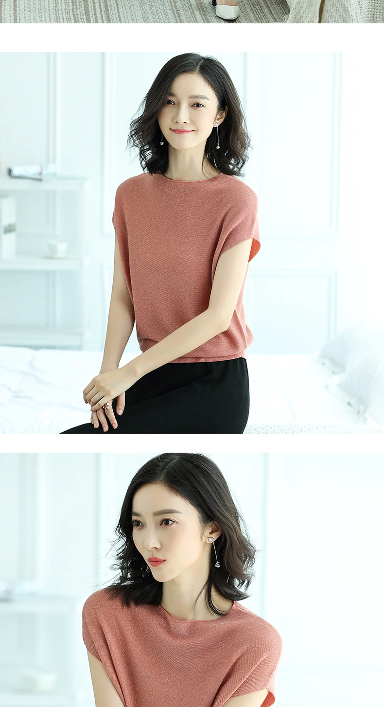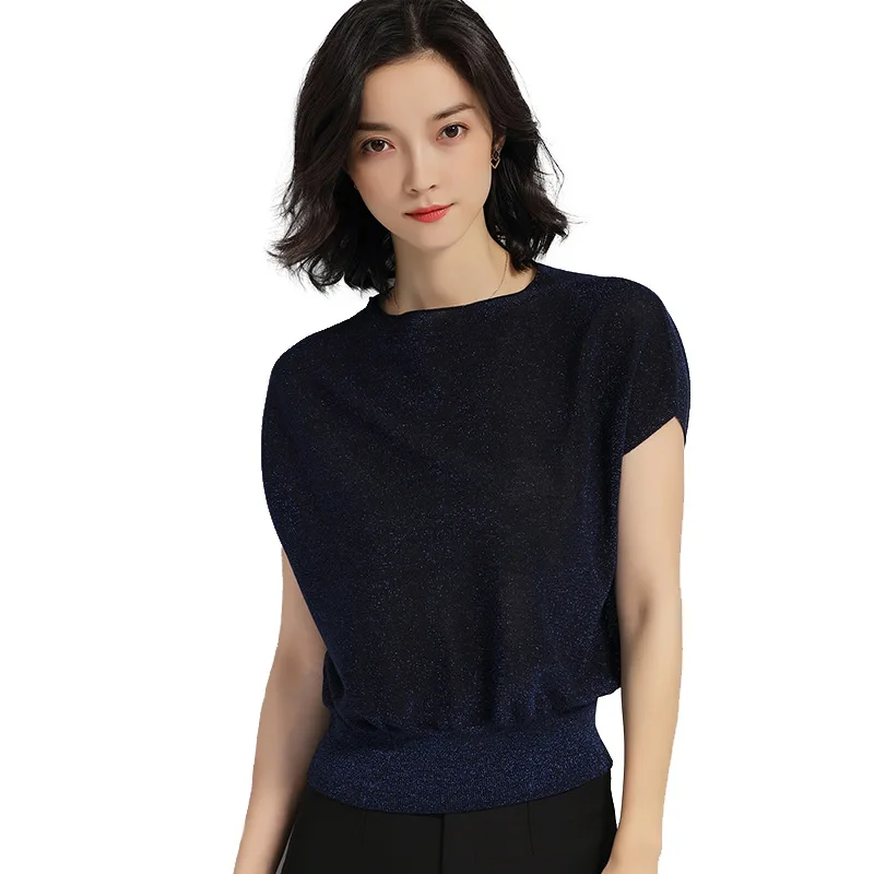 Женский Яркий шелковый трикотажный топ с рукавами летучая мышь, элегантный Свободный пуловер, блестящий синийхаки, лето 2021