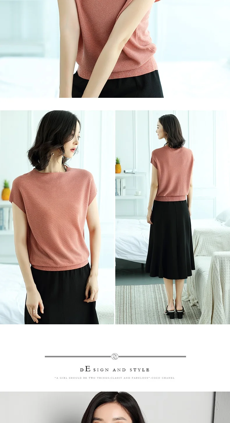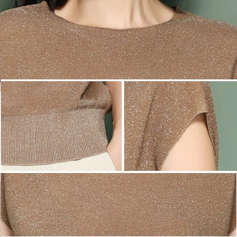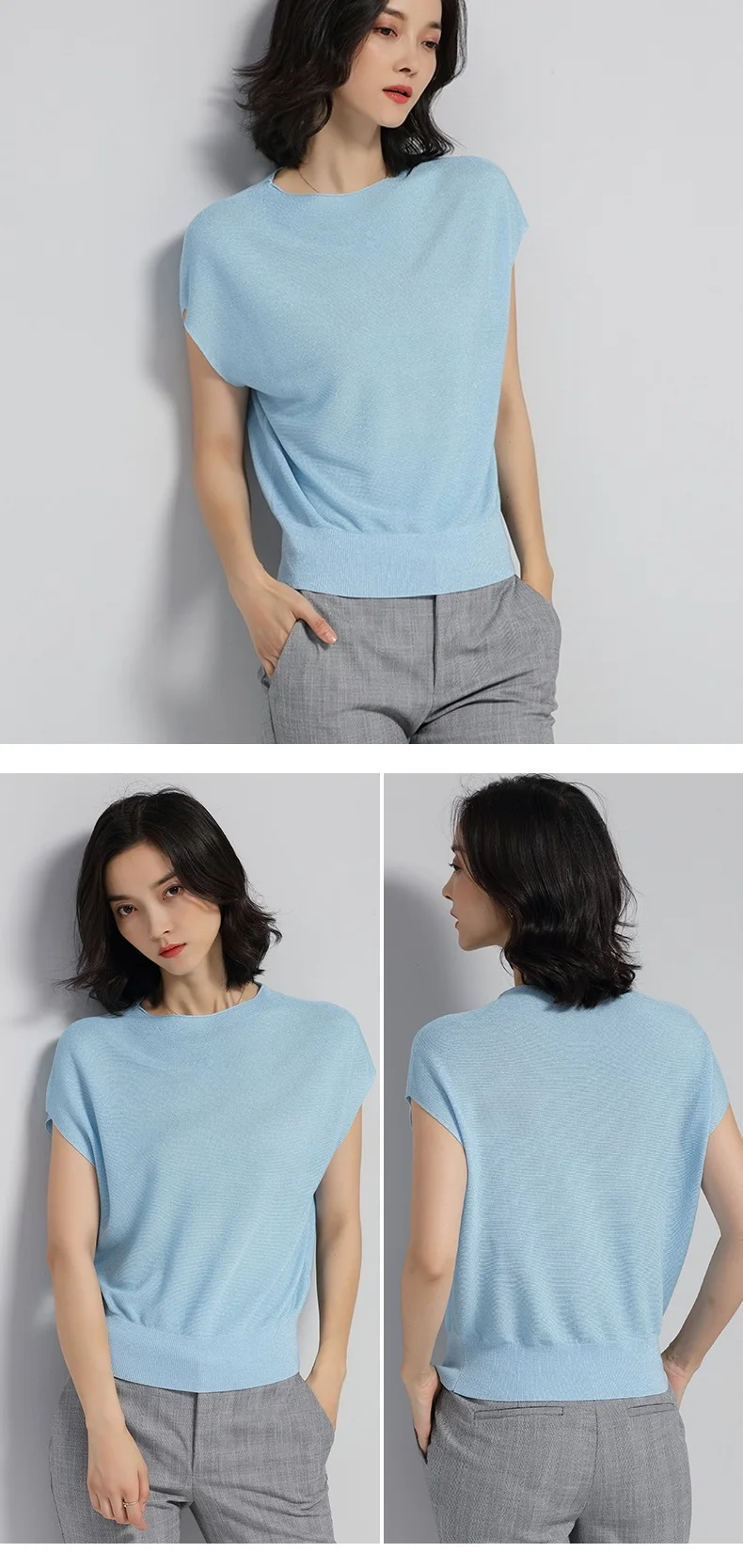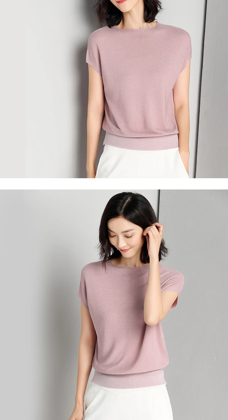 Женский Яркий шелковый трикотажный топ с рукавами летучая мышь, элегантный Свободный пуловер, блестящий синийхаки, лето 2021