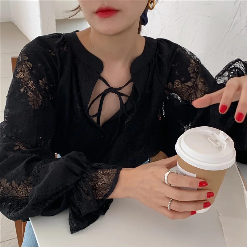 Blusas Новинка весны 2021 женские рубашки рубашка с кружевом топы с длинными рукавами модные фонарь Свободная блузка кардиган шикарный черный одежда 10202