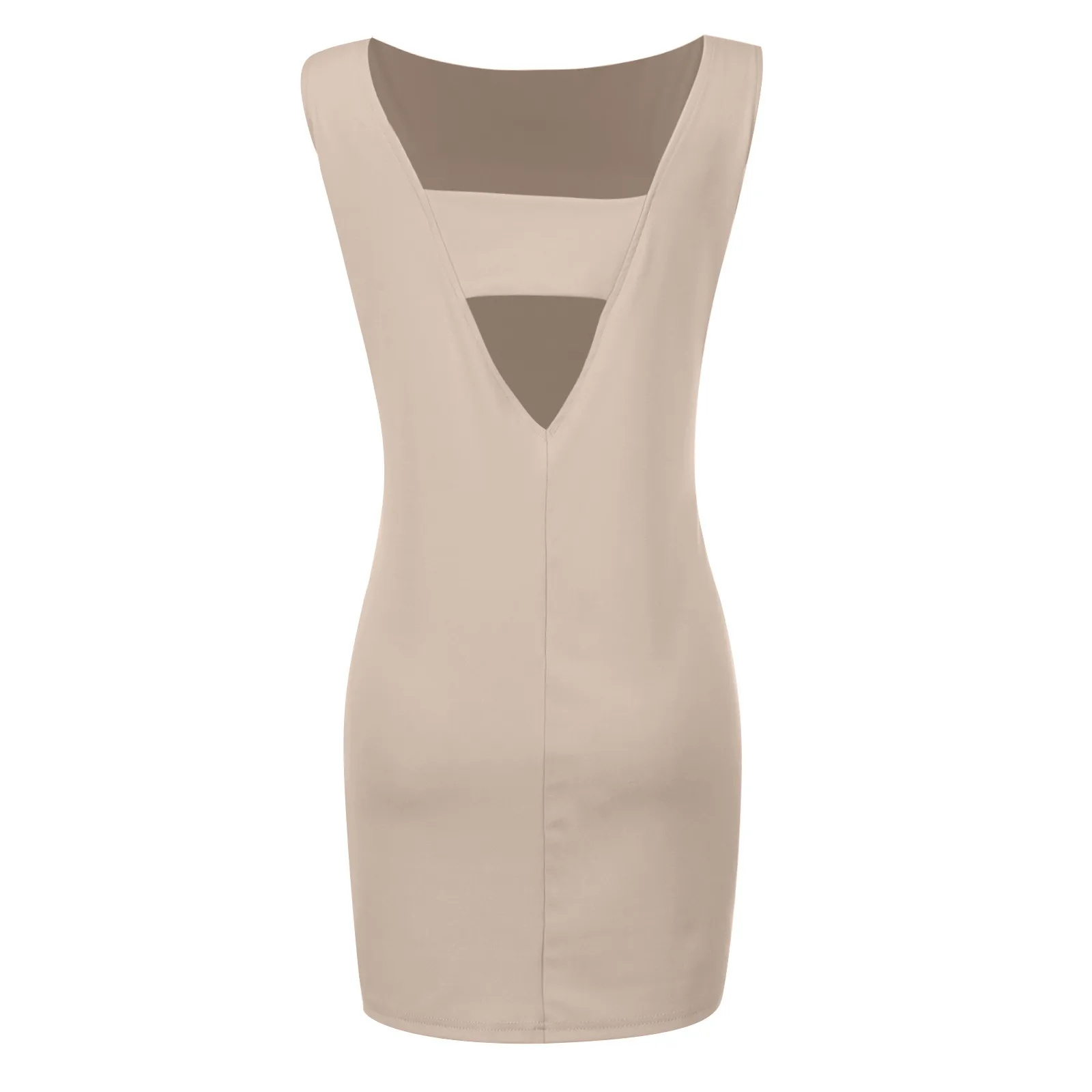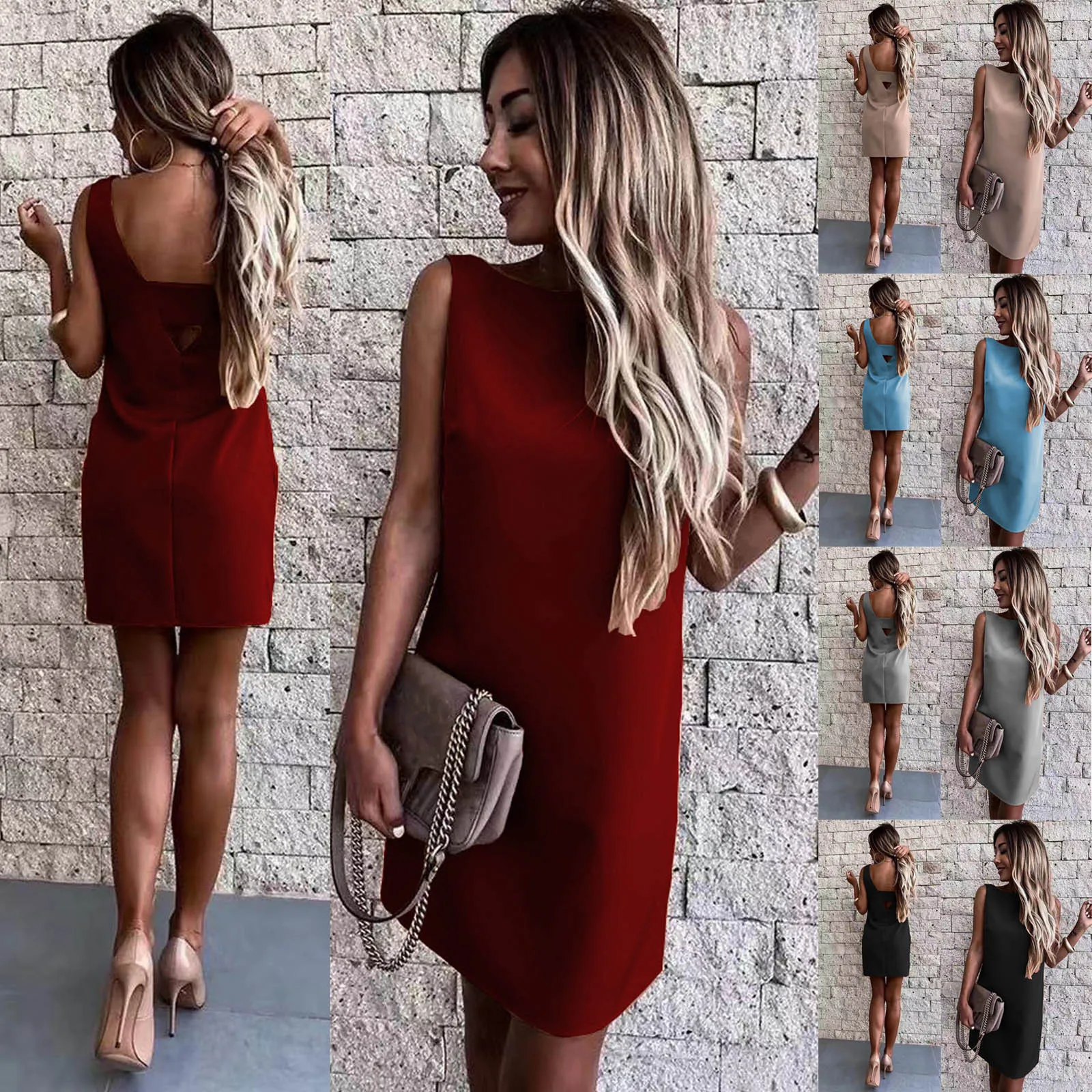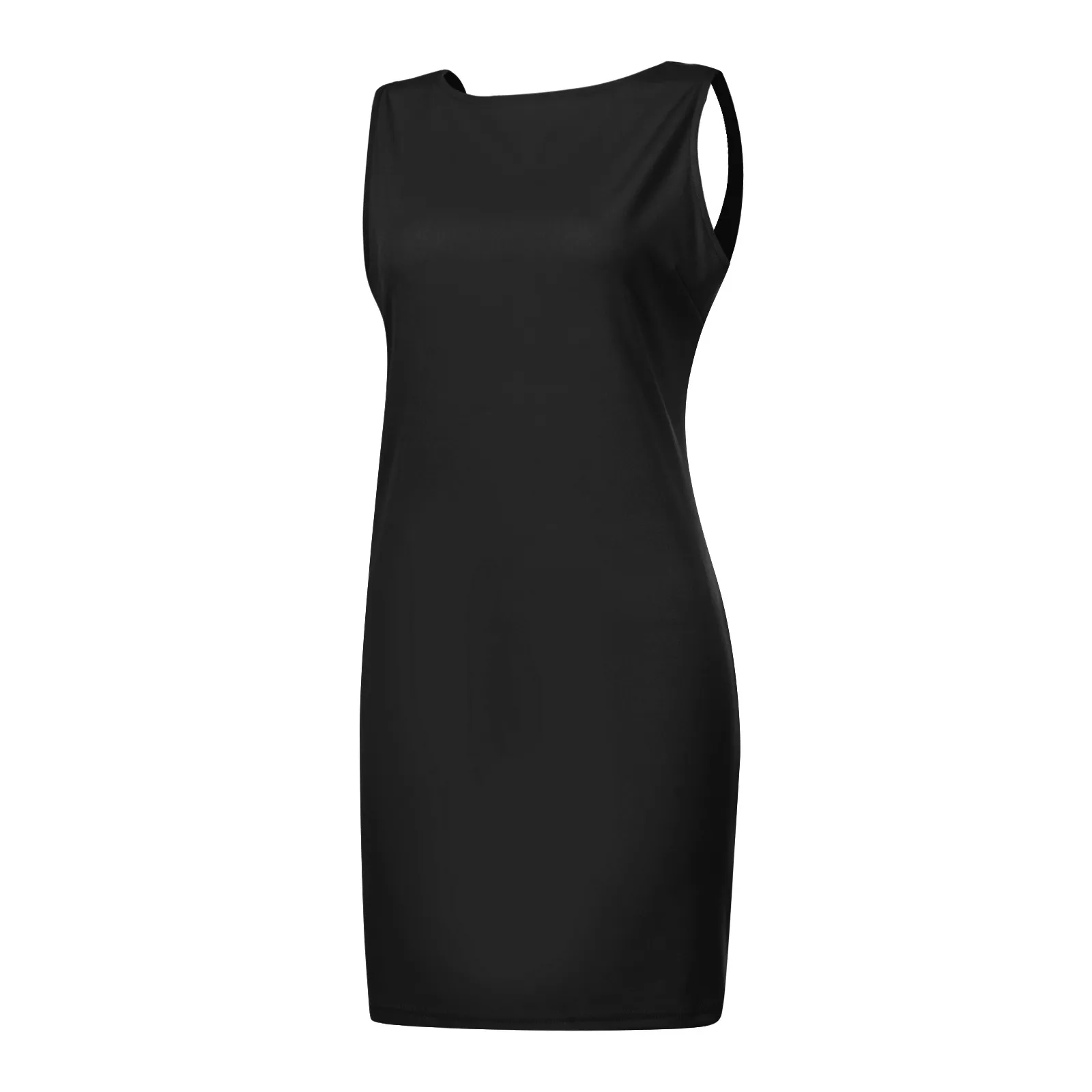 Женское однотонное офисное платье без рукавов с открытой спиной и круглым вырезом