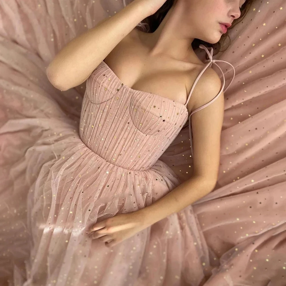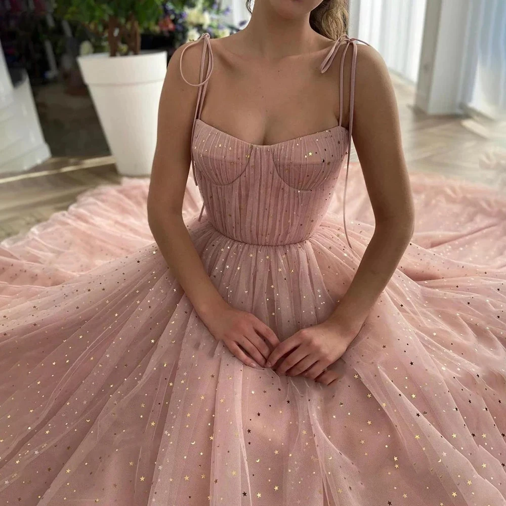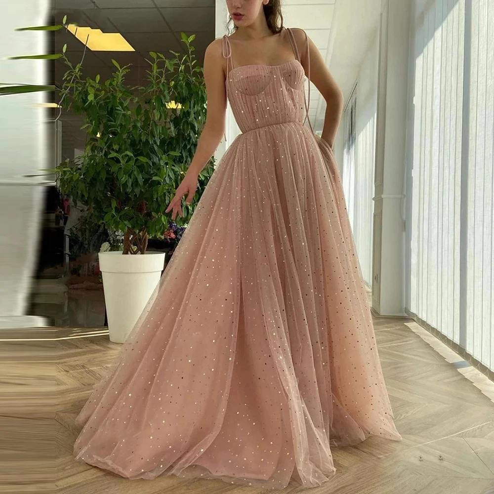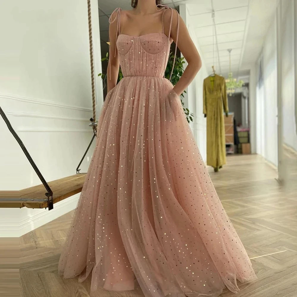 Детское розовое блестящее Тюлевое платье для выпускного вечера, Плиссированные Длинные вечерние платья на бретелях-спагетти с карманами, трапециевидные свадебные платья