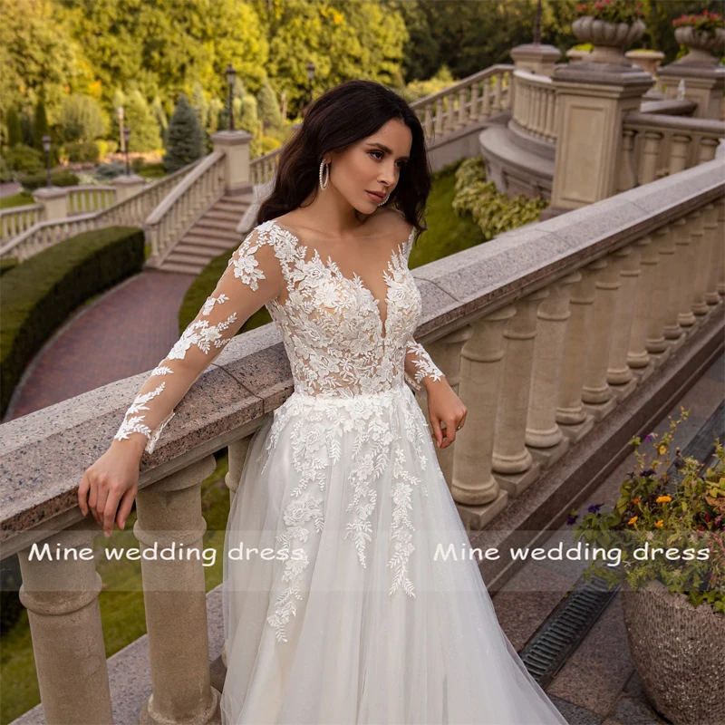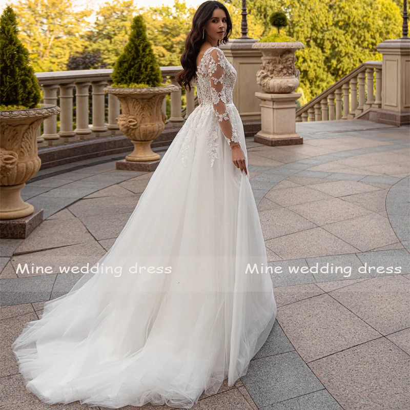 Кружевное свадебное платье-трапеция из тюля с длинными рукавами и аппликациями