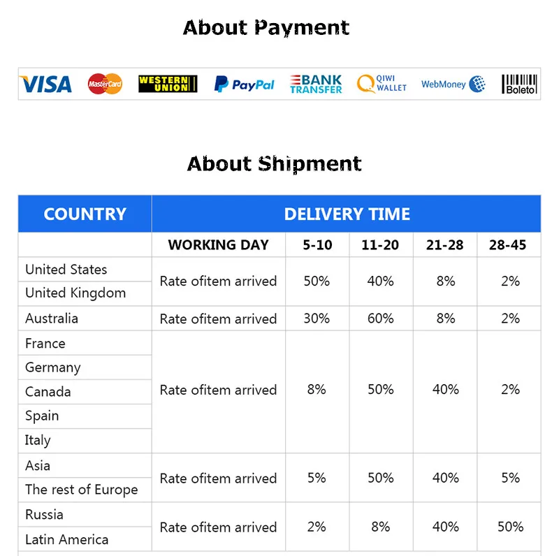 Как правило, ваш заказ будет отправлен из Китая через Почта Китая воздушную почту в течение 3-7 рабочих дней. Это около 15-60 дней для большинства стран, некоторые страны могут занять больше дней, таких как Бразилия, Аргентина. Если дата доставки приближается, но вы не получили товар, вы можете связаться с нами, чтобы продлить дату доставки.Возврат:Если вы получили дефектный или неправильный товар, или любые другие проблемы, пожалуйста, сначала свяжитесь с нами, вы делаете что-либо. Мы предложим вам удовлетворительное решение. Обратите внимание на фактический цвет. Это может немного отличаться от изображения из-за различных мониторов.
