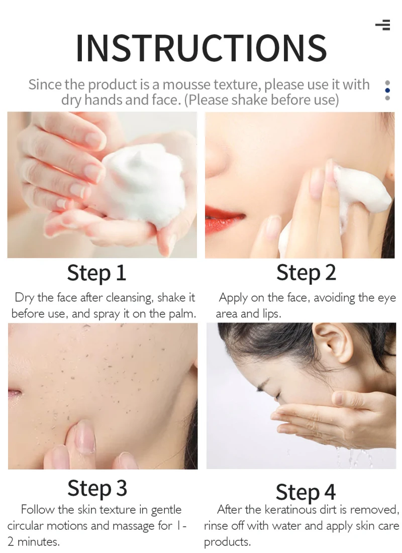 Хорошо встряхните перед использованием, нажмите, чтобы выдавить необходимое количество пены, равномерно распределите по лицу или другим частям, которые нужно очистить, Аккуратно помассируйте и краску водой.