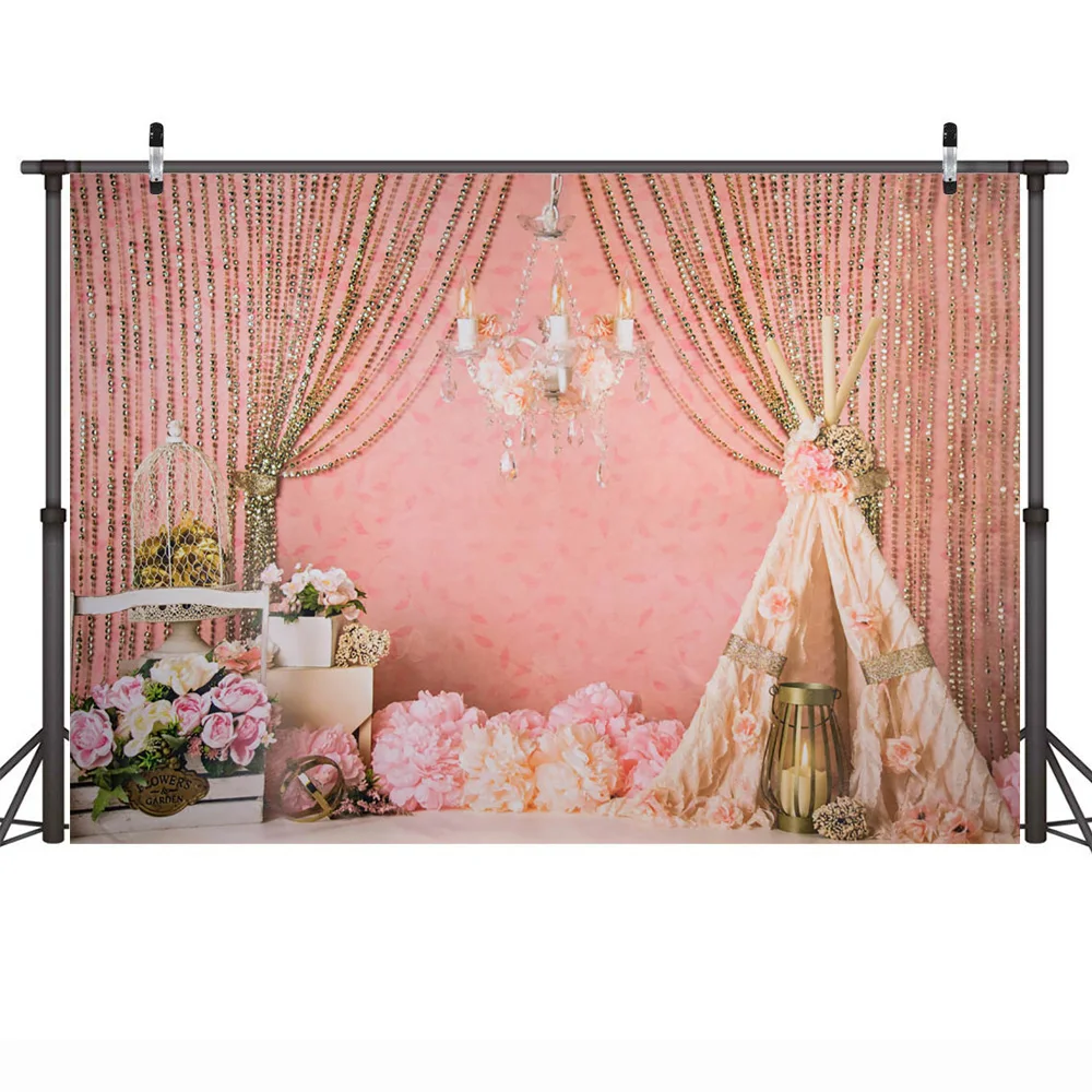 Розовые цветы милый день рождения торт разбивать фон цветочный кемпинг палатка Весна Дети Портрет фон Золотая занавеска фото