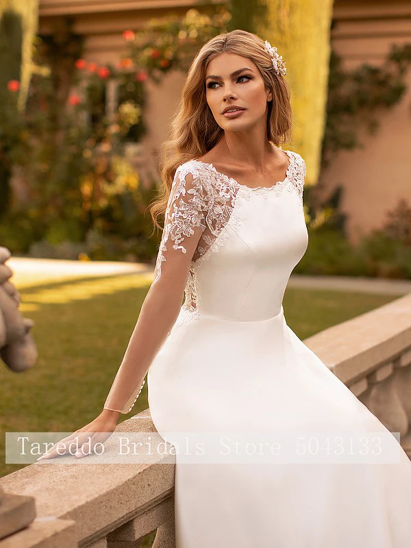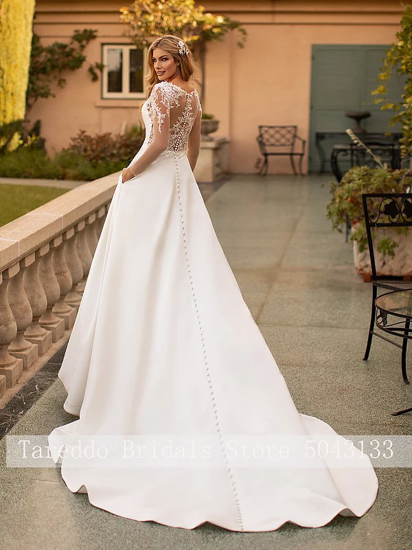 Скромное атласное ТРАПЕЦИЕВИДНОЕ свадебное платье с глубоким вырезом, карманами, кружевной аппликацией, длинными рукавами и пуговицами на спине, 2021