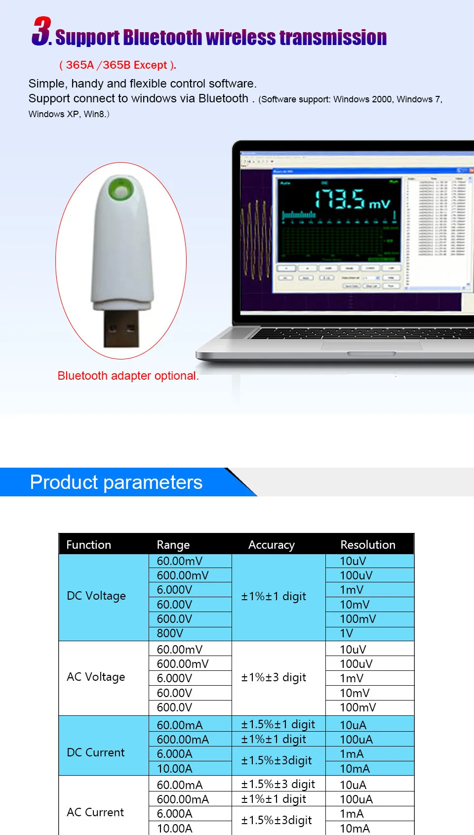 Описание:Долгое Время записывает напряжение, ток, сопротивление, емкость и ВКЛ-ВЫКЛ и т. д. в режиме реального времени, и создает кривые тренда.Безопасная электрическая изоляция и истинное измерение RMS.USB интерфейс Plug play, встроенный литиевый аккумулятор, поддержка беспроводной передачи bluetooth.Простое, удобное и гибкое программное обеспечение управления.Поддержка программного обеспечения: Windows 2000, Windows 7, Windows XP, Win8.