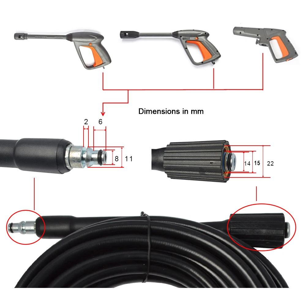 Шланг для этой марки мойки высокого давления. Пожалуйста, проверьте подходящий размер и убедитесь, что он подходит для вашей машины. Мы не несем никакой ответственности за несовместимость шланга. Если вы не уверены, пожалуйста, свяжитесь с нами и отправьте нам фото вашего пистолета, и фото обоих концов вашего шланга, мы поможем выбрать подходящий шланг.