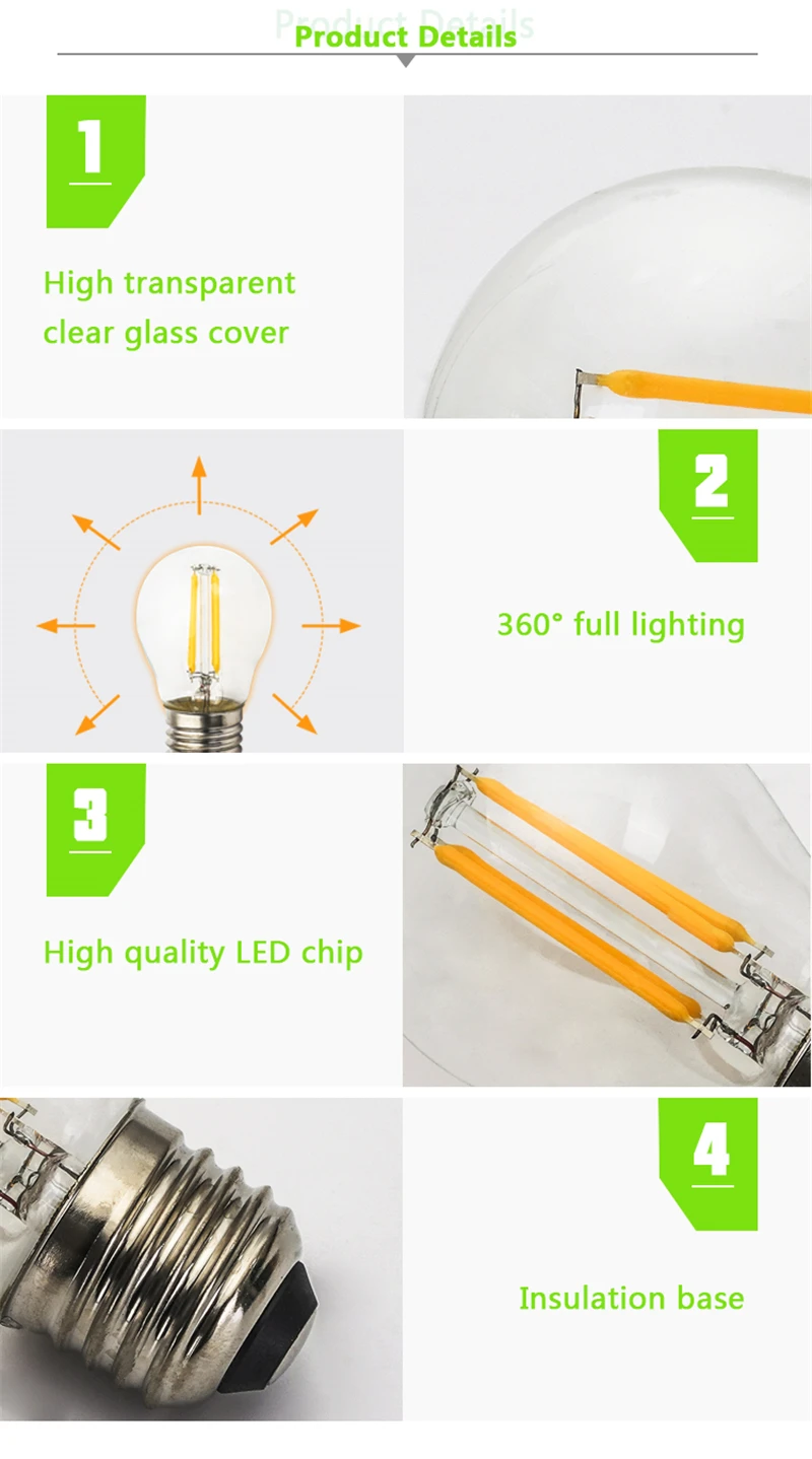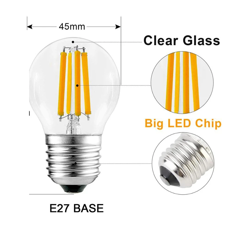 Тип цоколя: E27/E14 Мощность: 4 Вт/8 Вт/12 Вт/16 Вт Светодиодный Филамент: 2 шт./4 шт./6 шт./8 шт. Цветовая температура: холодный белый 6000-6500K/теплый белый 2700-3500K Напряжение: 220 В-240 В переменного тока CRI: 80Ra Угол луча: 360 ° Материал: стекло Средний срок службы:> 50000 часов