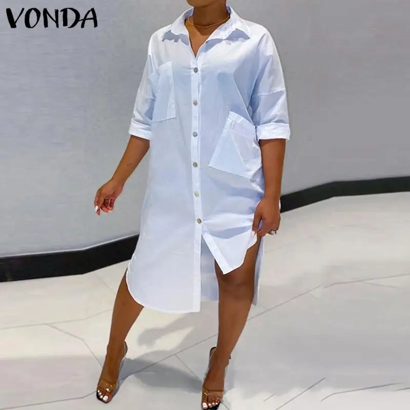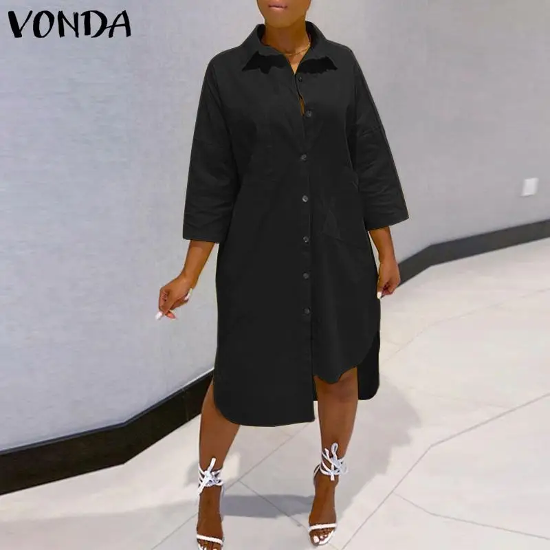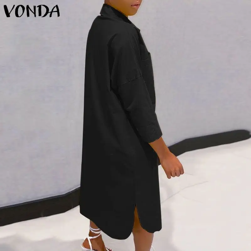 Платье-рубашка VONDA 2021 повседневное с отложным воротником однотонное платье до середины икры богемное платье летнее платье пляжный Сарафан