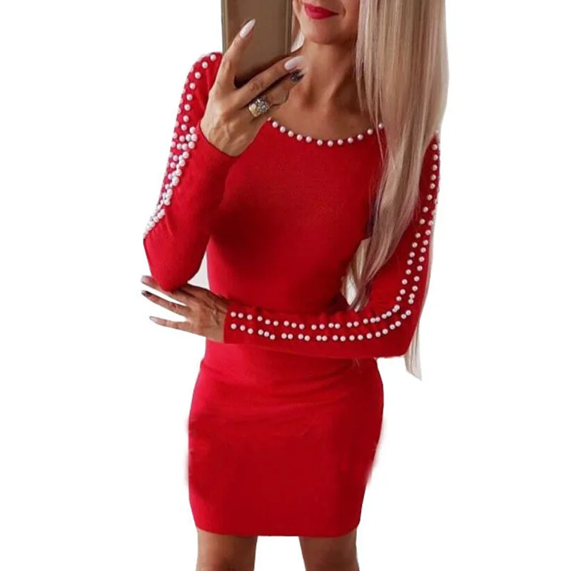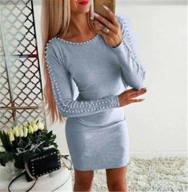 Женское модное облегающее платье-трапеция, однотонные пикантные облегающие мини-платья с длинными рукавами и бисером на бедрах