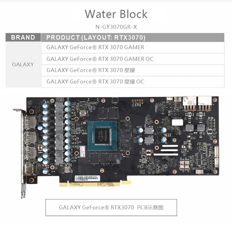 Петля: неалюминиевая (Включая, помимо прочего, следующие модели) GALAXY RTX3070 геймер GALAXY RTX3070 GAMER OC GALAXY RTX3070 GALAXY RTX3070 OC Совместимость основана только на эталонном дизайне, блок может не соответствовать измененному/суперблокированному и другим вариациям сторонвечерние ителей, которые отличаются от эталонного дизайна. Фитинги: Резьба G 1/4 Запасные задние пластины: из-за разницы в креплении между картами запасные задние пластины не подходят.