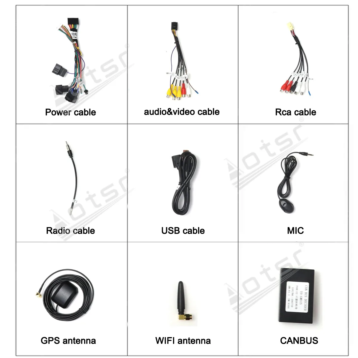 Наш продукт поставляется с GPS антенной, gps-картой для вашей страны, usb-адаптером, аудио и видео входным кабелем, кабелем питания... и т. д., все наборы для установки будут в посылка.