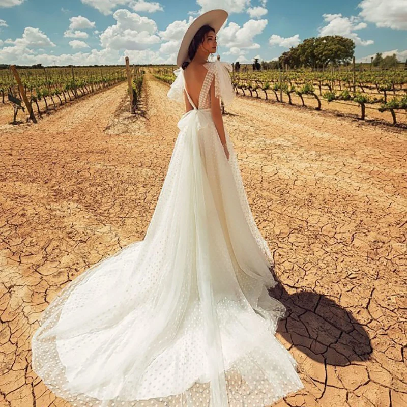 Романтическое элегантное платье невесты из фатина в горошек с открытой спиной длинное простое платье с открытой спиной без рукавов со шлейфом